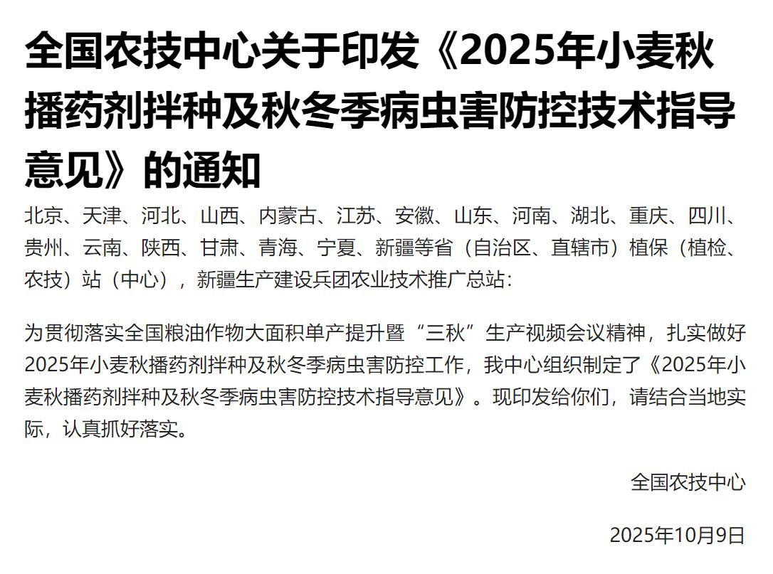 全国农技中心印发了《2025年小麦秋播药剂拌种及秋冬季病虫害防控技术指导意见》的通知。