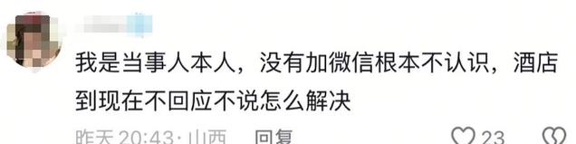 根据他们工作人员的讲述:酒店已经加了女子的微信正在解决。但是当事人称:没有加微信根本不认识酒店到现在不回应也不说怎么解决。