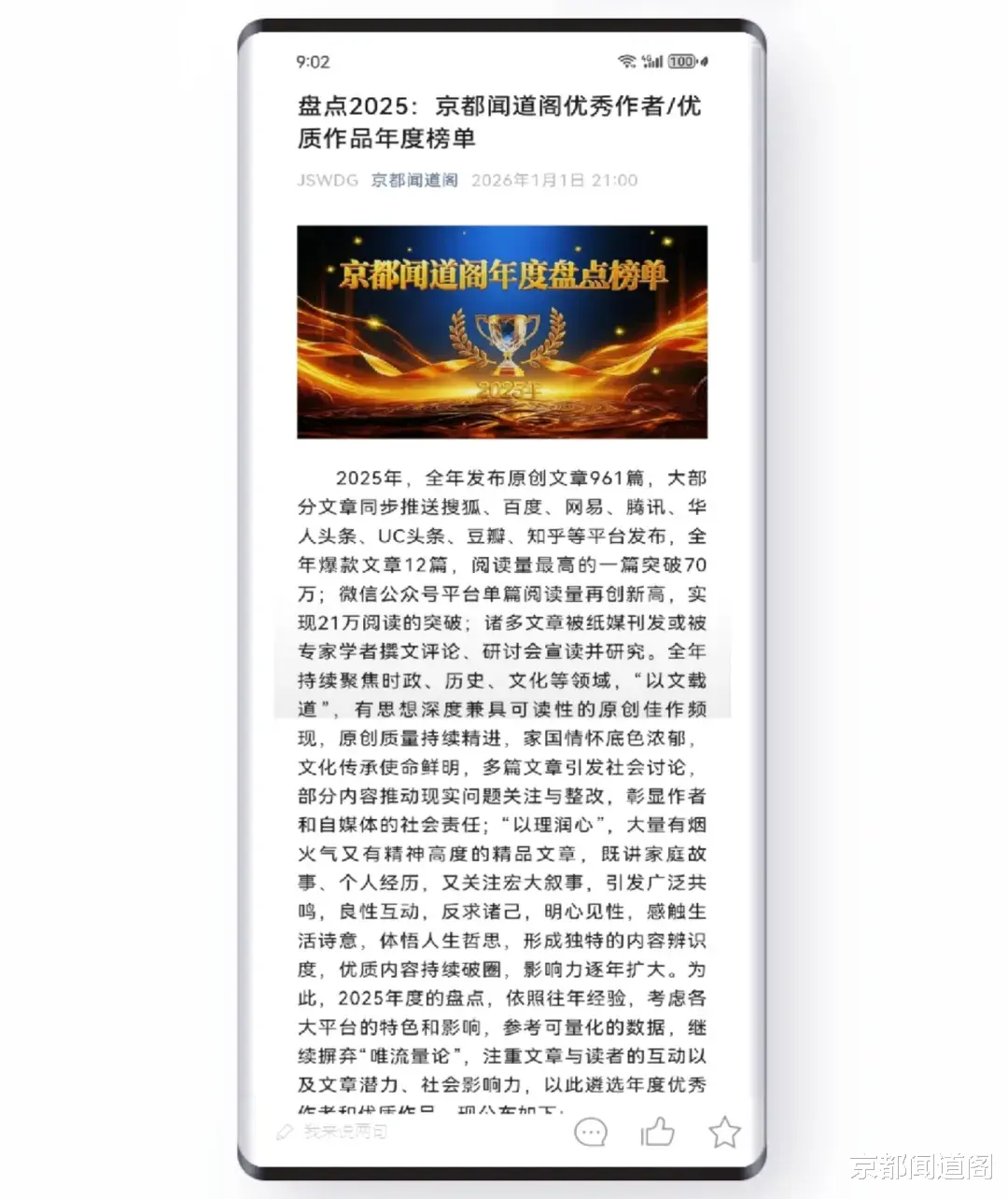 “京都闻道阁”平台的价值取向越来越鲜明,社会功效越来越显著,知名度和影响力也在逐年提升。这除了编辑的把脉定向和认真努力外,与一群高水平原创作者的勤奋笔耕也是分不开的。