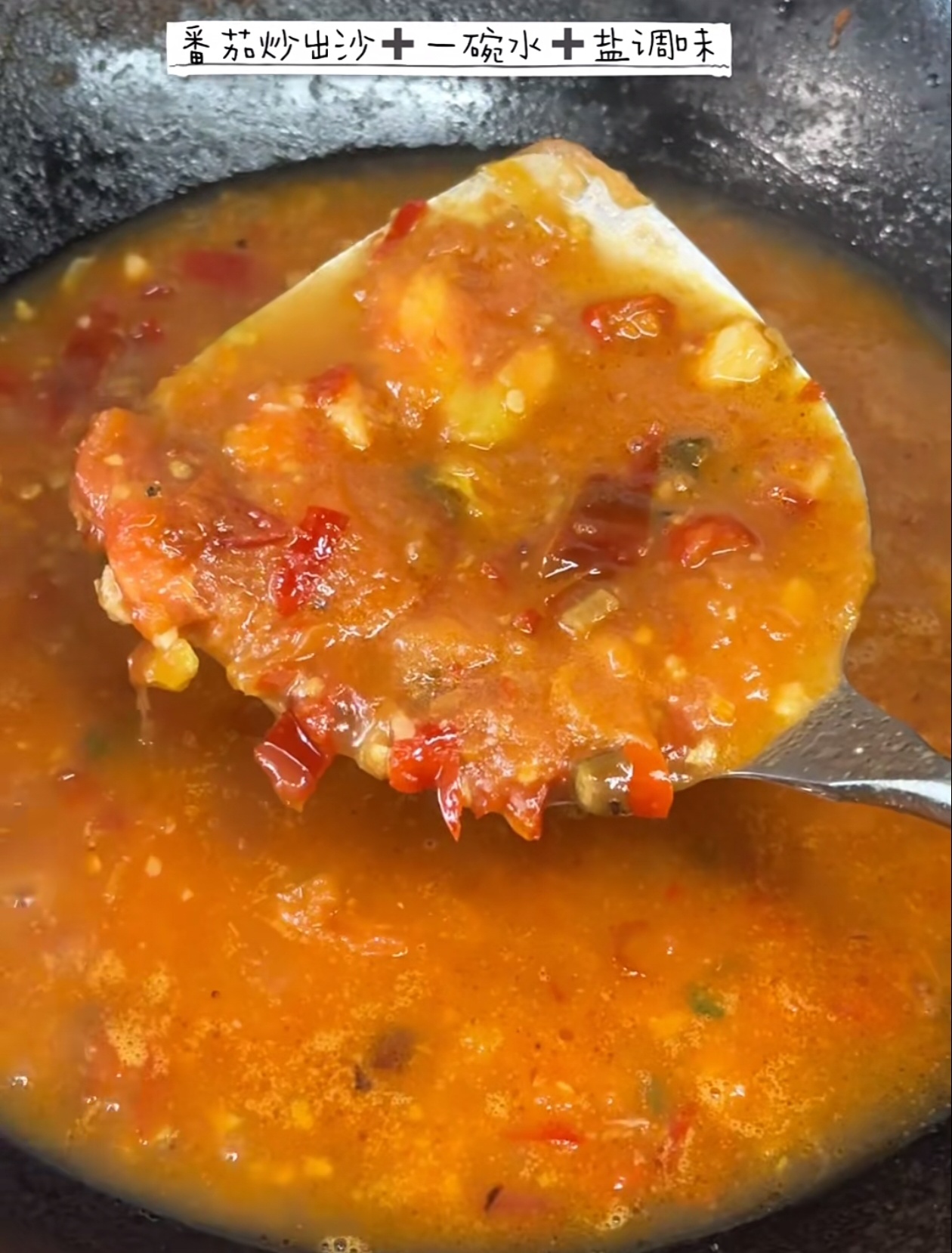 看到番茄炒出细腻的沙质后,加入一碗清水没过食材,加少许盐调味,转中小火熬煮3-5分钟,让番茄的酸甜和泡椒的鲜辣充分融合成浓稠的汤底。