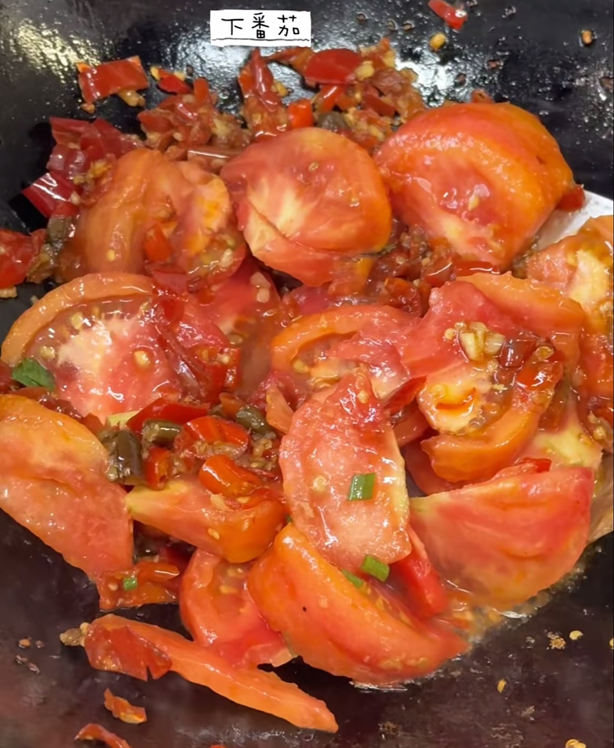 起锅倒油,油温六成热时先倒入泡椒碎翻炒出香气,再加入蒜末炒出香味。这一步要保持中火,避免把蒜末炒糊。闻到浓郁的酸辣香气后,倒入切好的番茄块,转大火快速翻炒,直到番茄变软出沙。