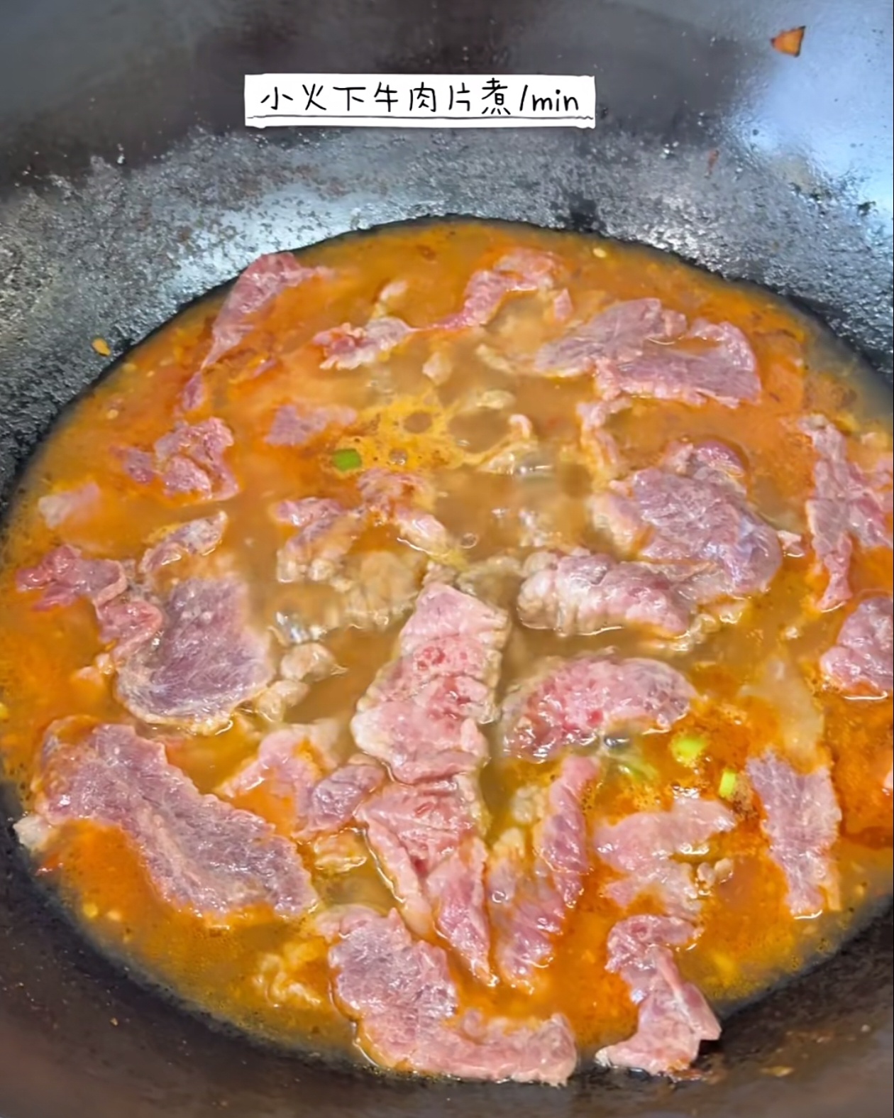 转最小火,把腌制好的牛肉片一片一片分散放入汤中,避免粘连。全部下完后保持小火煮1分钟,让牛肉均匀受热,这样口感才会滑嫩不老。