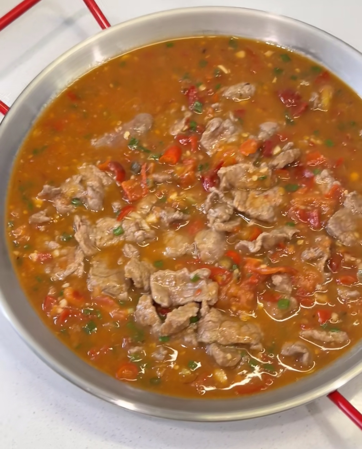 夹一块牛肉送入口中,先是泡椒的鲜辣在舌尖炸开,紧接着番茄的酸甜慢慢散开,嫩滑的牛肉在齿间轻轻化开,连带着汤汁一起拌上米饭,每一口都充满了层次分明的酸辣鲜香。家人吃得满头大汗却停不下筷子,直说这是近期最下饭的菜。