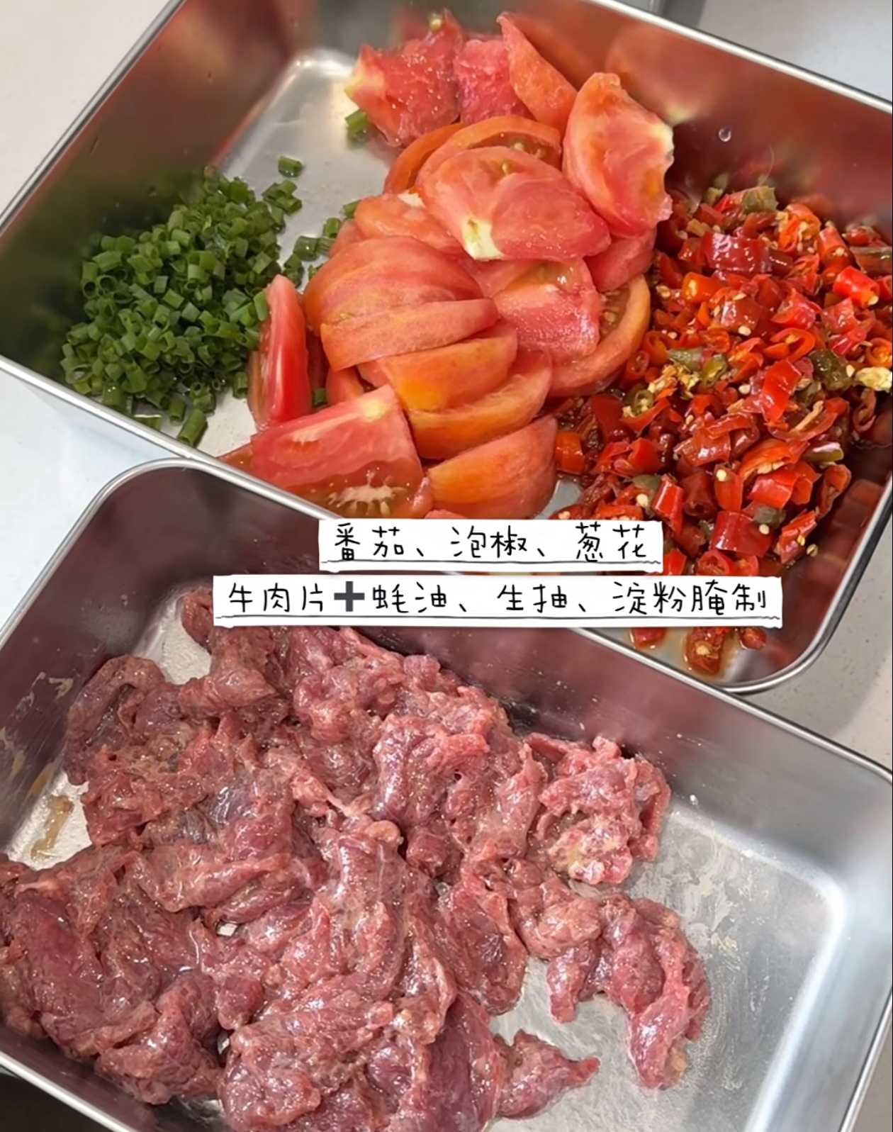 先准备好所有食材:新鲜牛里脊切片,加入一勺蚝油、两勺生抽和适量淀粉,用手抓匀后腌制15分钟,这样牛肉会更嫩滑不柴。准备两个中等大小的番茄切块,一碗泡椒切碎,再切点蒜末和葱花备用。