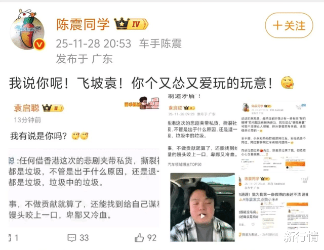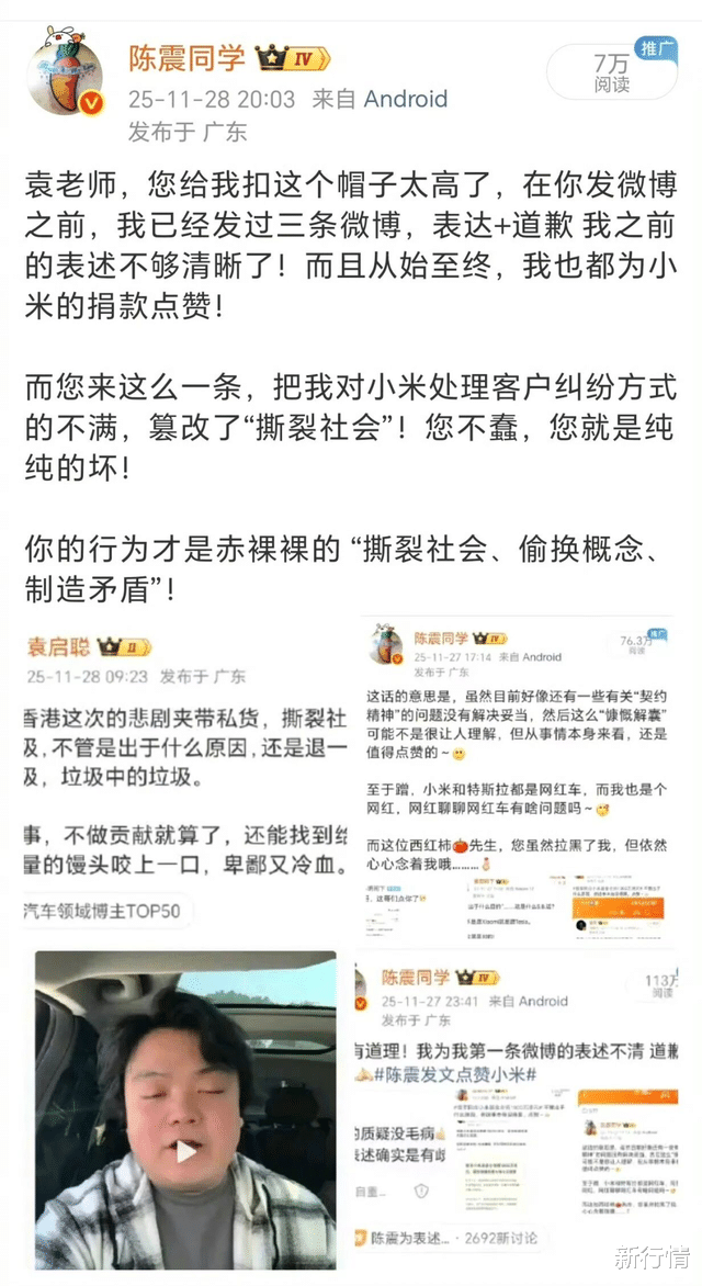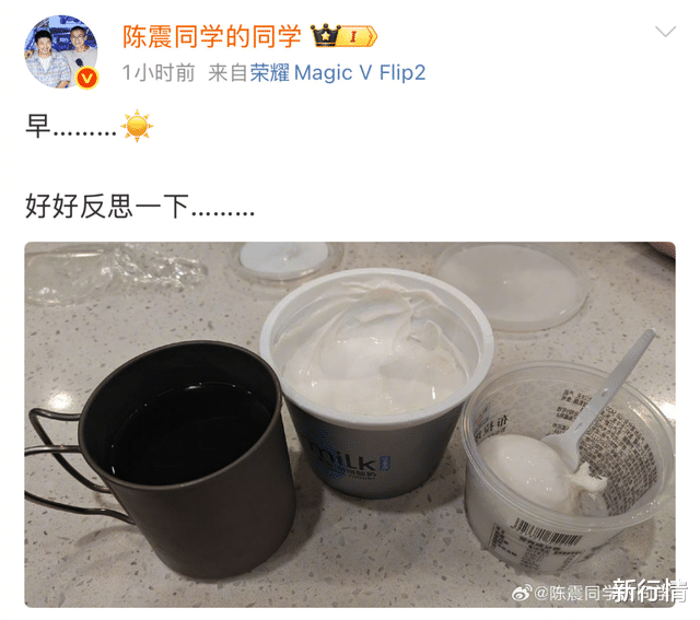 今早,陈震还在小号“陈震同学的同学”悄悄试探蹦跶,发文称:“好好反思一下………”并在视频中表示:“没啥可说的,自作自受,多检讨自己,会好好反思,应该多给大家带来一些乐观的正能量,而不是一些很激烈的言辞,吃一堑长一智,以后会注意。”