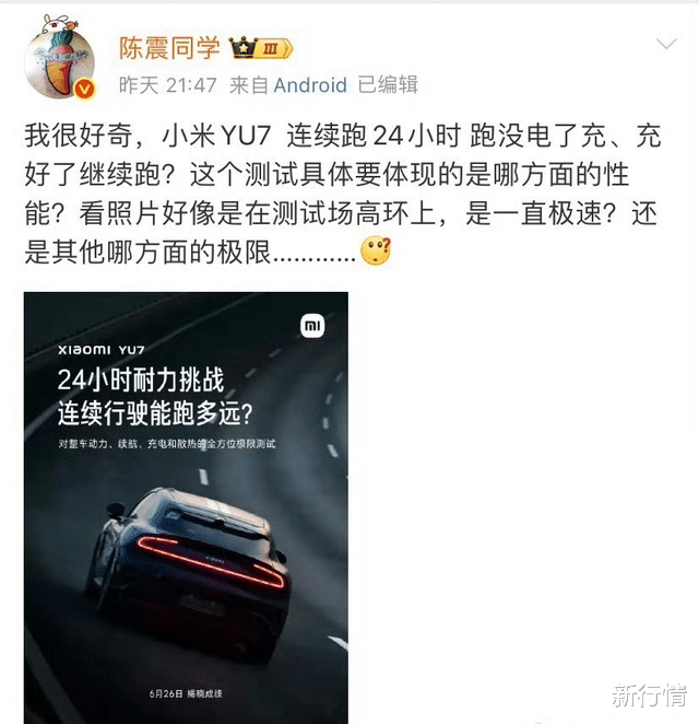 小米YU7上市前,雷军宣传新车的“24小时耐力挑战”,表示这项极限测试堪比“勒芒24小时耐力赛”——对标奔驰、保时捷,换人不换车,超高速连续24小时跑到底。