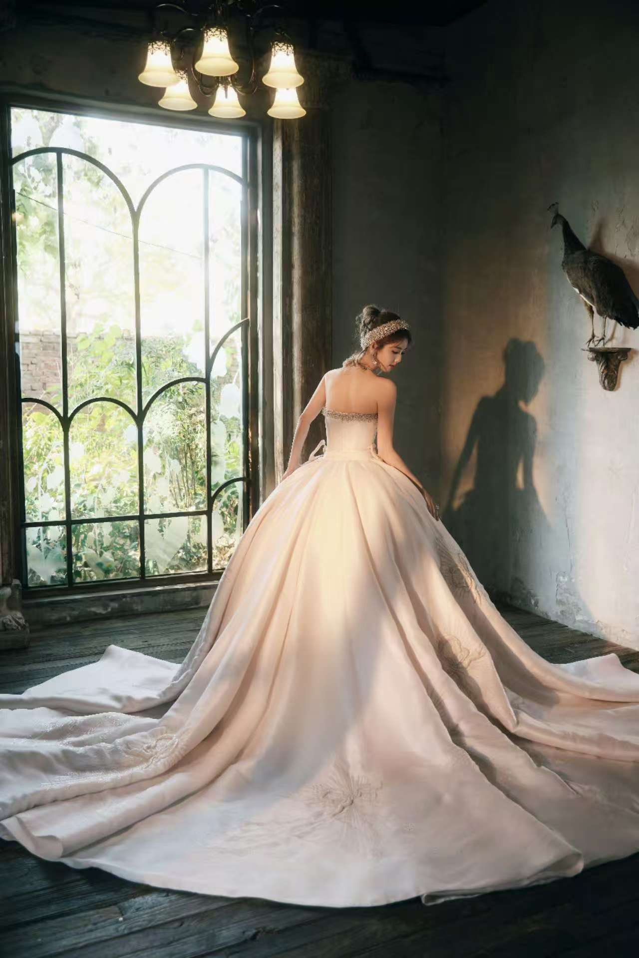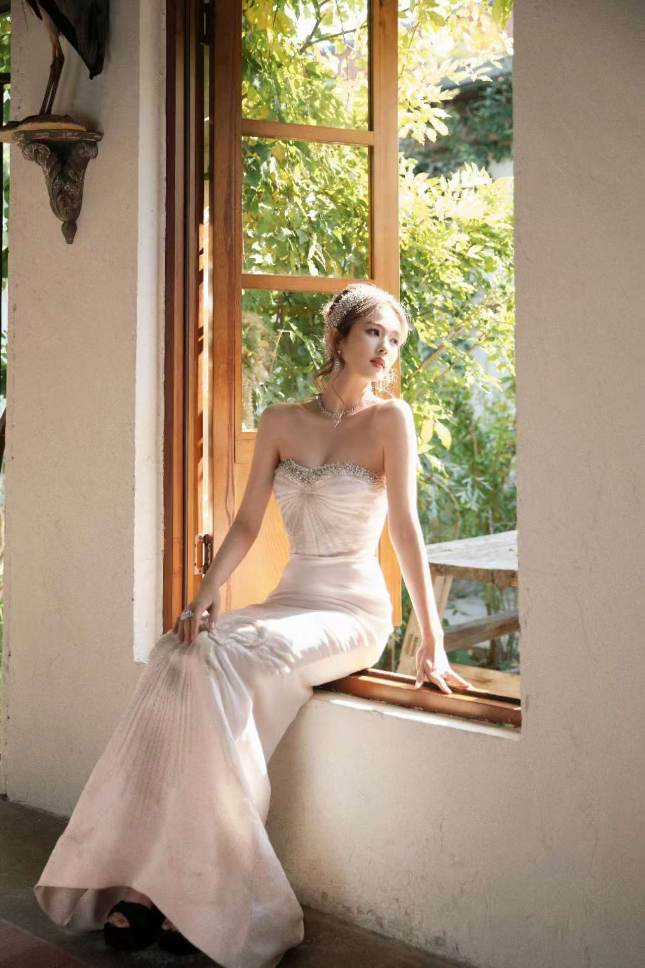 她坐在流淌的日光里,鱼尾裙摆如涟漪散落窗台;抹胸缎面折射柔光,颈间项链与头饰星点闪烁。木质窗棂外绿影摇曳,仿佛自然为婚纱