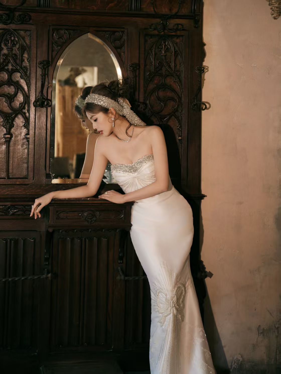 抹胸缎面折射柔光,颈间项链与头饰星点闪烁。