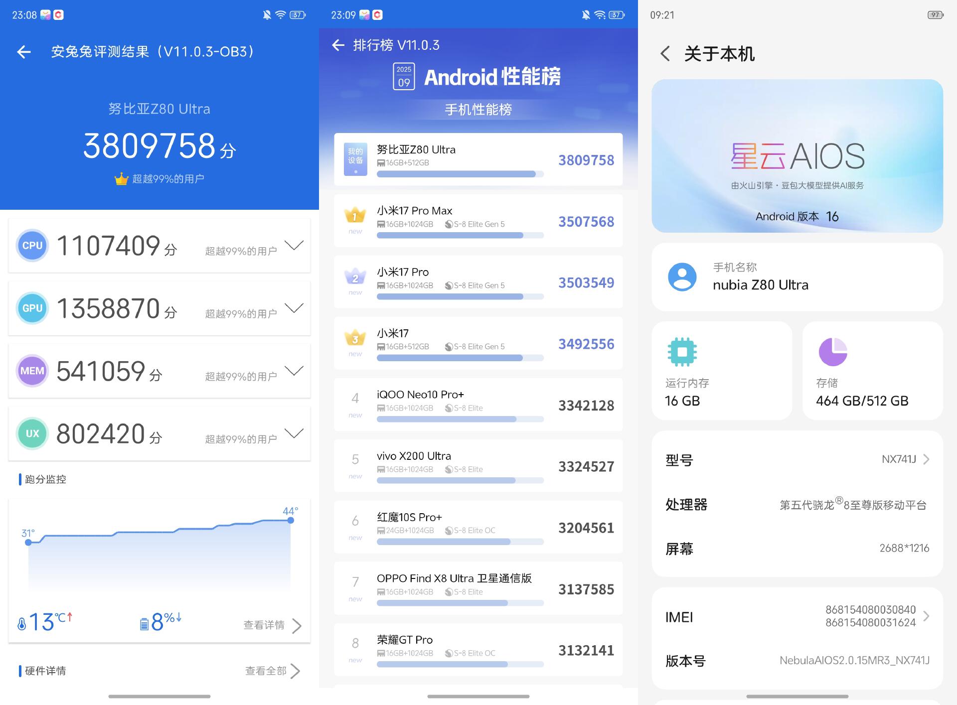 努比亚Z80 Ultra的性能配置也是top级别,搭载了第五代骁龙8至尊版处理器,配合满血版LPDDR5X内存+UFS 4.1存储组合,最高支持16GB+1TB的存储方案。在安兔兔评测中我随便跑跑就超过了380万分,而且可以明显看出在整个高负载测试过程中,机身温度控制表现也很出色,有力印证了其卓越的散热设计与强悍的性能释放能力。