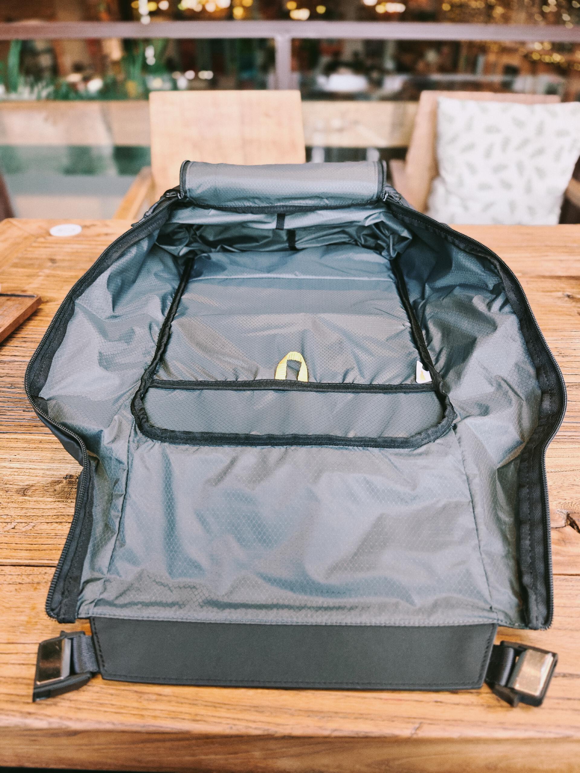 拉开两侧的拉链就能将整个前侧全部掀开,就像是敞开的行李箱一样,能够从容的整理各种物品,比如叠好的衣物等,摆放起来十分轻松,出去旅行或者带的东西比较多的时候更能体会到这样的便利性,巨大的空间足以应对两三天的短途出行需求了。