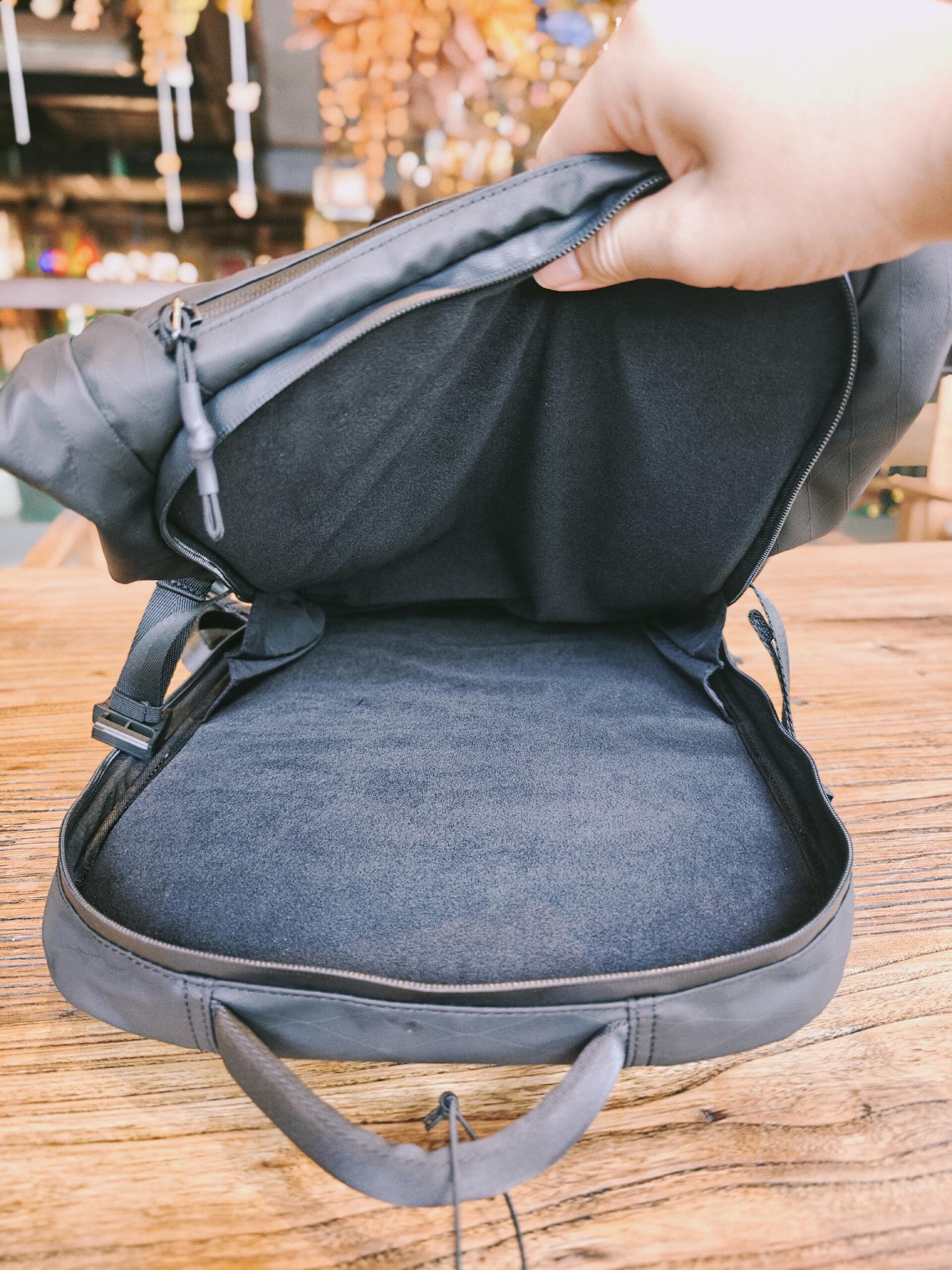 主仓后部还有一个单独的分隔层,两侧采用的是绒面材质,带来了较好的防护效果,更适合作为电脑仓使用,可以轻松放入一个17寸的笔记本电脑,放一些pad一类的自然更不在话下。