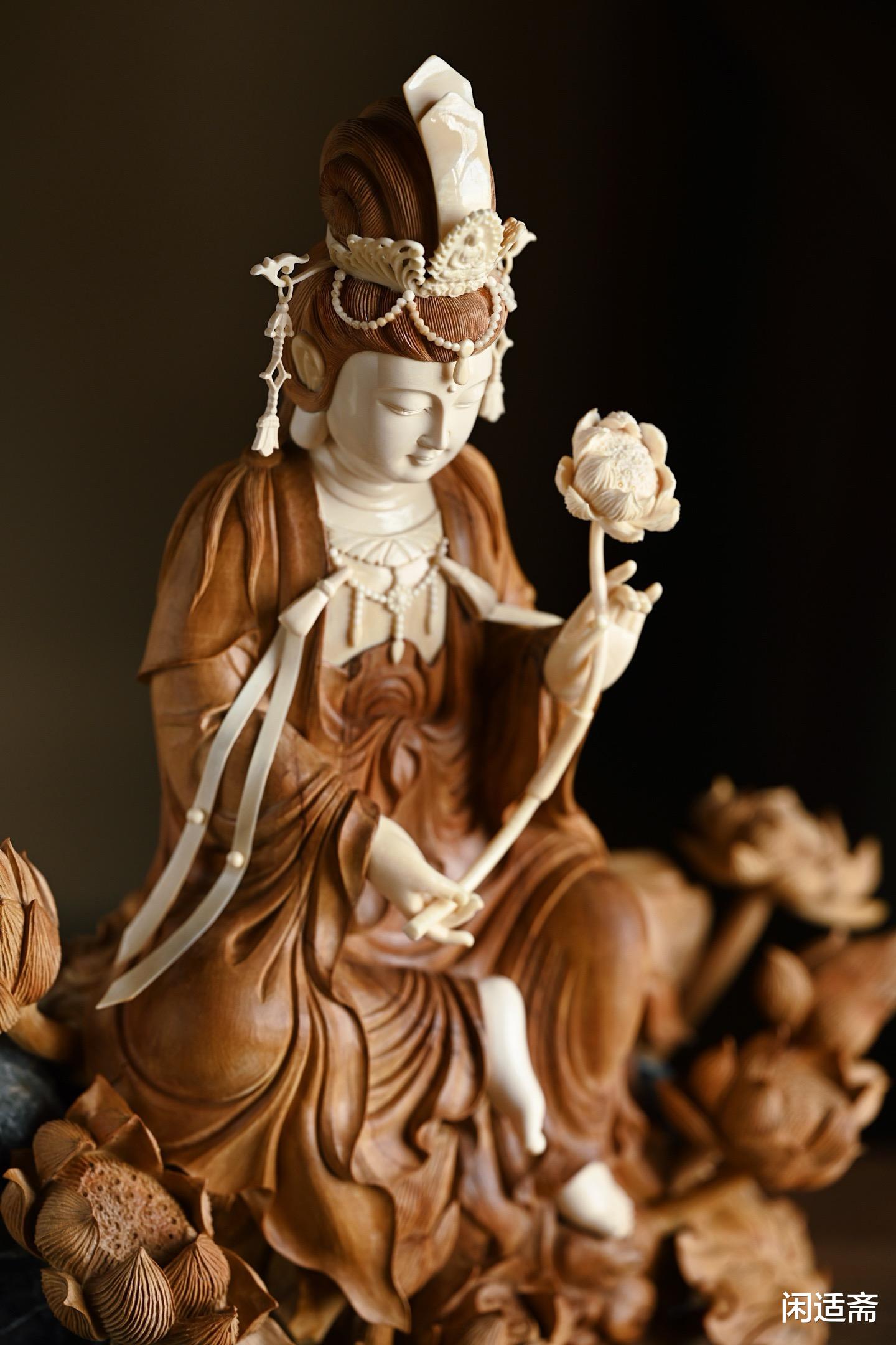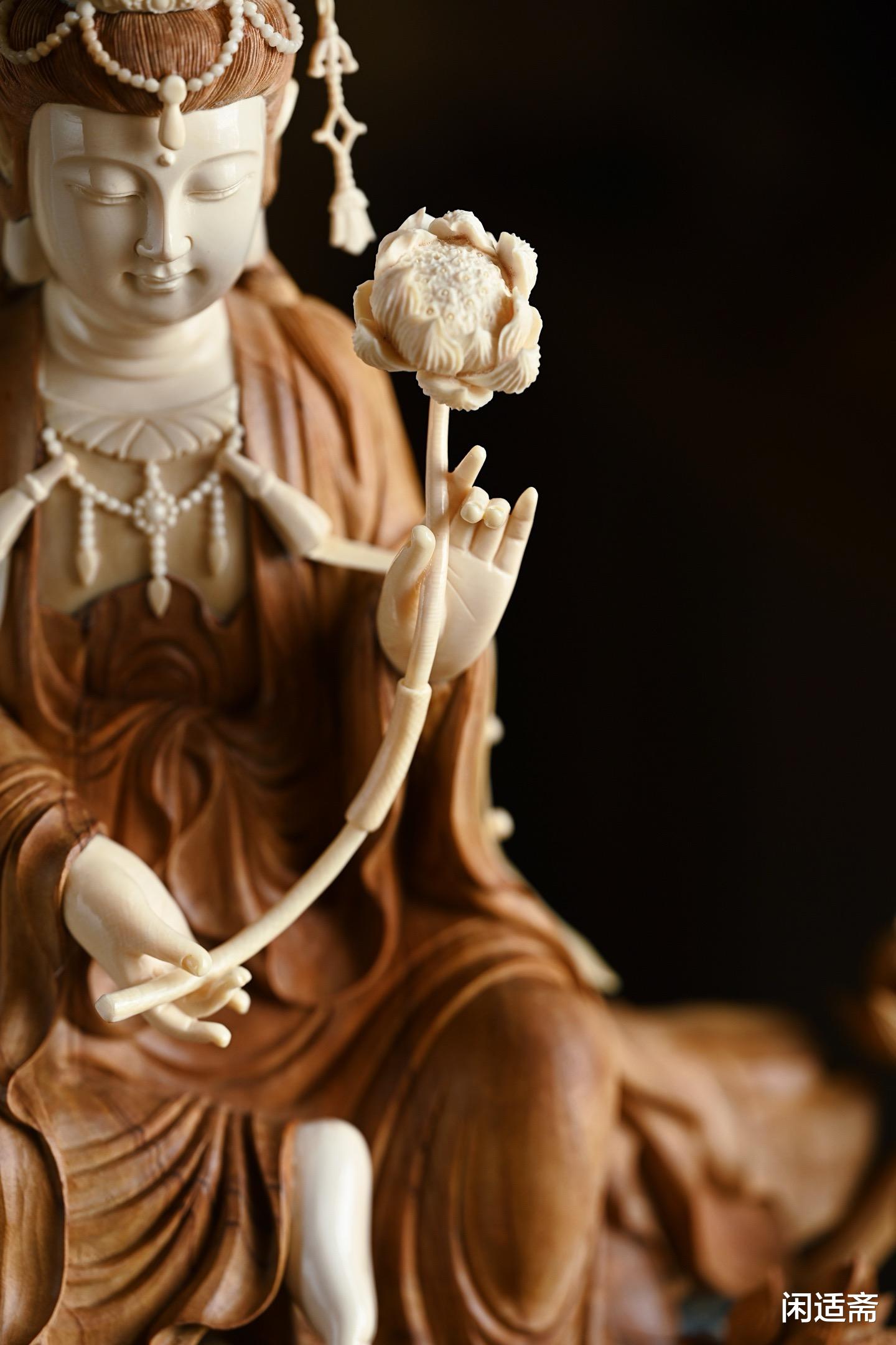 这尊造像不仅是匠人技艺的结晶,更是老山檀、猛犸象牙两种珍稀材质的价值载体,承载着持莲观音的文化内涵与慈悲寓意,成为兼具信仰意义、艺术价值与收藏潜力的中式珍品。