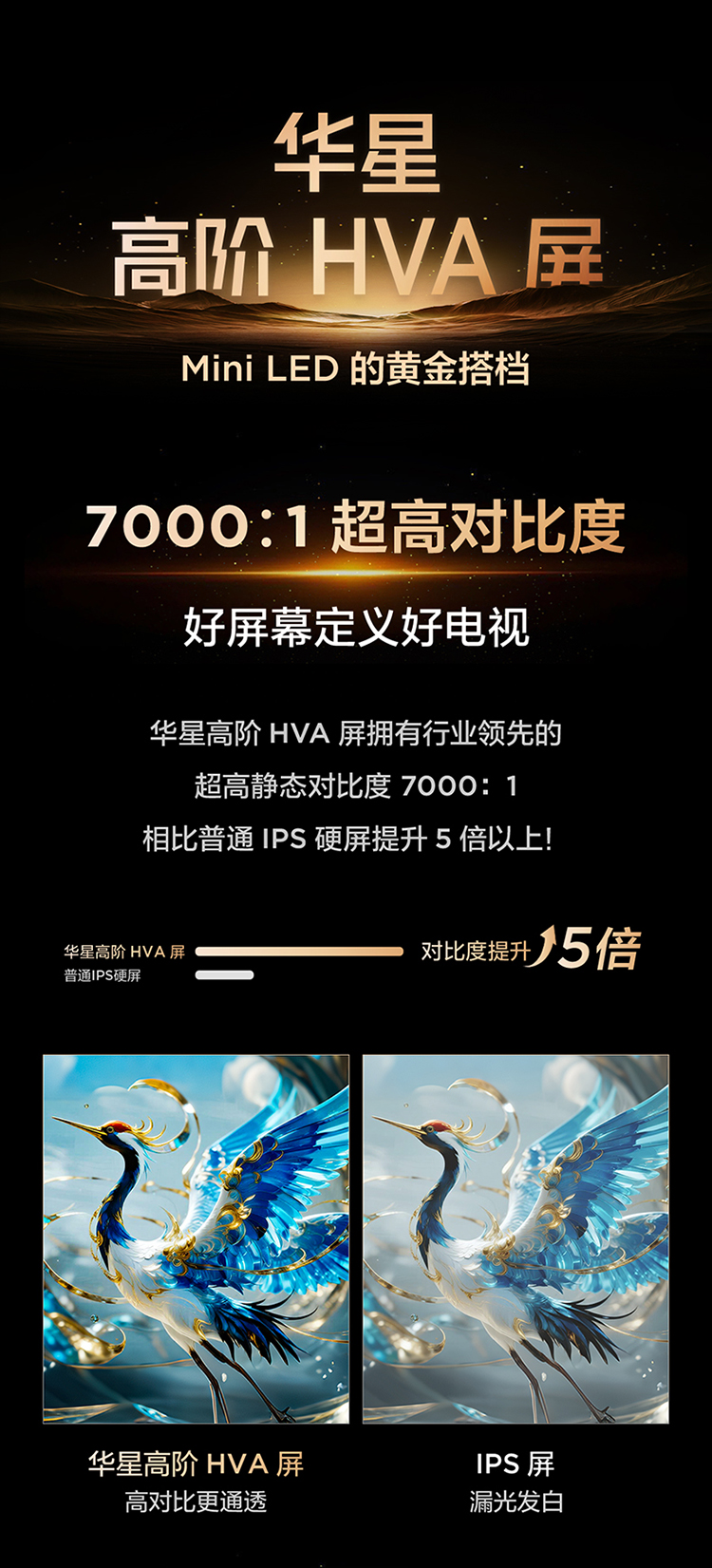 不少电视,白天追剧时,阳光一照屏幕就全是反光,只能把窗帘拉得严严实实,屋里黑得跟晚上似的。这方面,鹤6 26款用的是华星高阶HVA屏,和Mini LED搭配在一起简直是绝配,静态对比度能到 7000:1,比普通IPS硬屏强了5倍还多,之前那种IPS屏漏光发白的问题完全没有了。而且它还加了1.3%的内低反层,相当于给屏幕加了双重抗反光的保护。以后周末白天追剧,终于不用在 “晃眼看不清” 和 “屋里黑漆漆” 之间纠结了,想怎么看就怎么看。