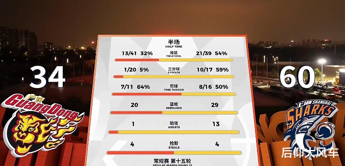 前半节广东三分全铁失误不少(胡队三分3中0,上空篮还不进),半节落后上海6-16。