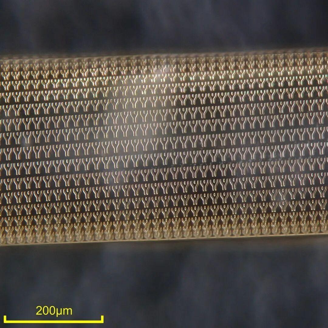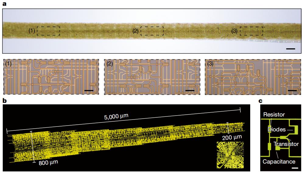 这款纤维芯片既保持了纤维本身柔软和可编制的特性,也实现了电阻、电容、二极管、晶体管等电子元件的高精度互连,光刻精度达到了实验室级别光刻机的最高水平,未来可以将发光模块和传感模块等集成在一根纤维上,形成无需外接设备的全闭环系统,最终有望实现自供能。