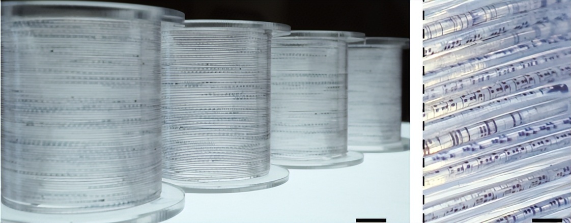 研究团队从卷寿司中获得了灵感。他们找到了一张富有弹性的薄膜,然后使用非常精细的光刻技术画出电路图案,接着就像在紫菜上铺好米饭和食材一样,把这张薄膜卷起来形成了一根细长的纤维。这样一来,纤维内部就不再是一层,而是许多层电路叠在一起,这极大增加了空间利用率。基于这一原理,他们把这种方法叫做多层旋叠架构。
