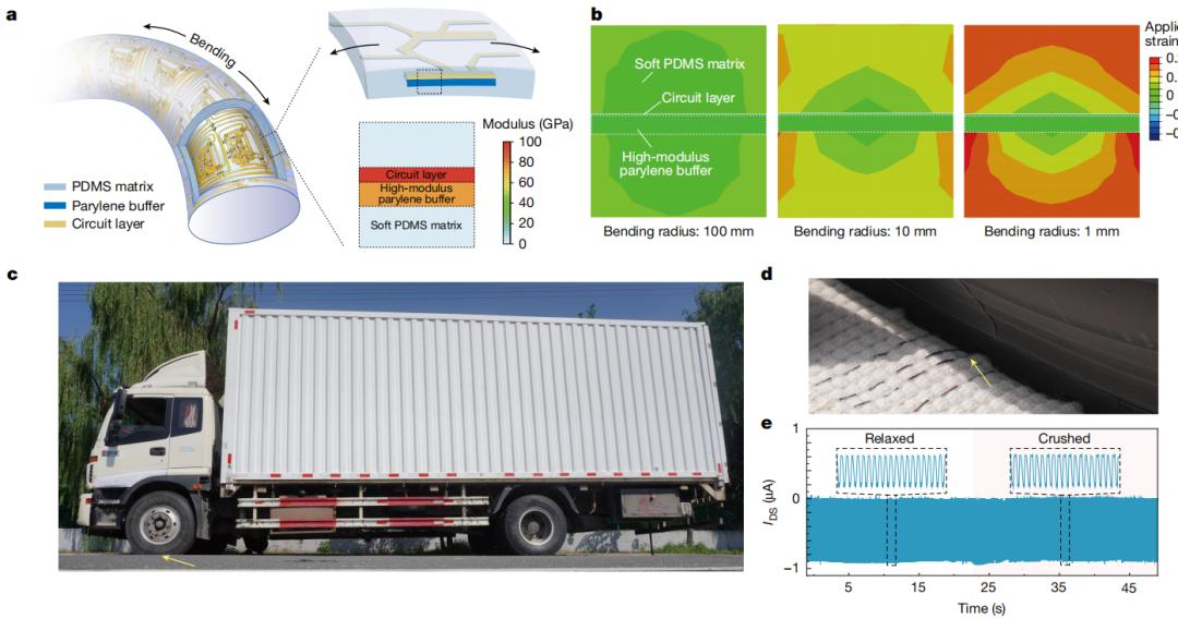 假如将纤维芯片的长度拓展到 1 米,其集成晶体管的数量有望提升至百万级别,这将让其能够比肩经典计算机中央处理器的集成能力。它可以承受 1 毫米半径的弯曲、20% 的拉伸形变,也可以被随意打结,被重达 15.6 吨的卡车压过、甚至被水洗上百次之后,性能依然十分稳定。