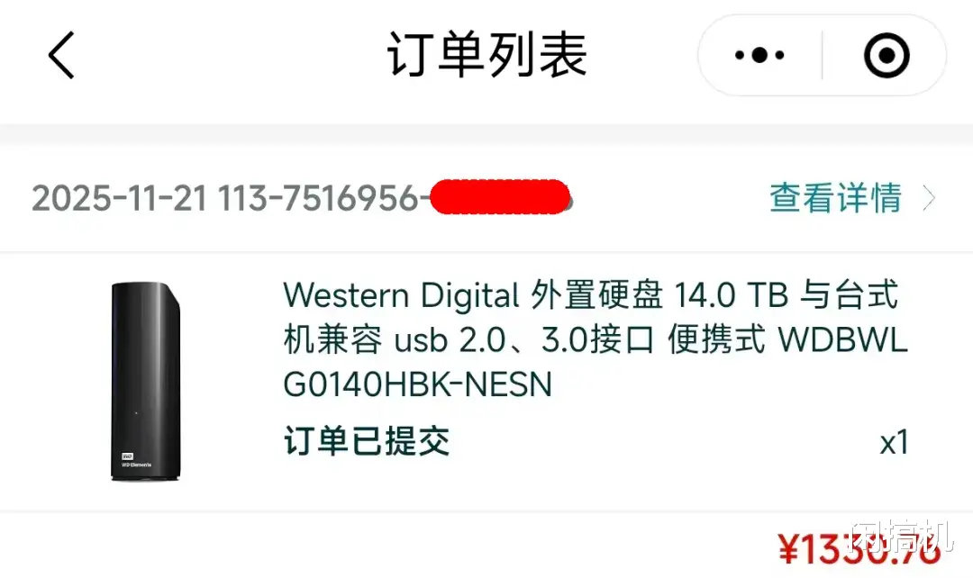 这里说个题外话,我也是预判明年存储还得涨,上周五趁着美国亚马逊的西数14T硬盘出现1221.08元的低价,加上进口费用合计1330.76元下了一单,折合1TB是95元,梦回涨价前。不过预计12月8日-31日送达,转运时间好久啊。