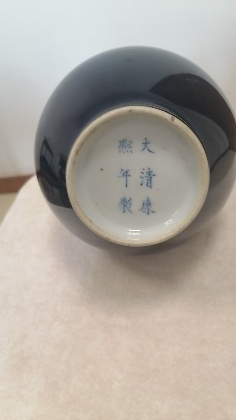 底部 “大清康熙年制” 的青花款识,是这只赏瓶的 “身份铭牌”。康熙时期是清代制瓷的 “黄金时代”,单色釉品类尤为兴盛,霁蓝釉更是以 “釉色纯正、胎质细腻” 著称。这款识不仅佐证了它的宫廷血统,更映照着康熙朝制瓷业 “精益求精、追求极致” 的工艺精神。