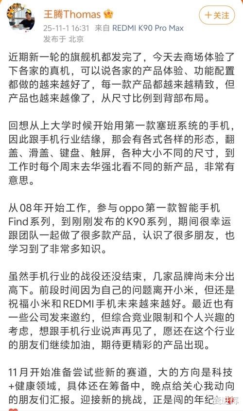随后,他话锋一转,透露自己的最新动向。王腾爆料,最近有一些公司发来邀约,但综合竞业限制和个人兴趣的考虑,想跟手机行业说声再见了。“11月开始准备尝试些新的赛道,大的方向是科技+健康领域,具体还在筹备中。”他的言下之意是,自己从此彻底退出手机圈,并将在科技+健康领域创业。