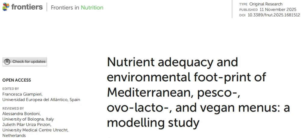 ALCALÁ-SANTIAGO Á, RODRÍGUEZ-MARTÍN NM, CASAS-ALBERTOS E, et al. Nutrient adequacy and environmental footprint of Mediterranean, pesco-, ovo-lacto-, and vegan menus: a modelling study[J]. Frontiers in Nutrition, 12:1681512. DOI: 10.3389/fnut.2025.1681512