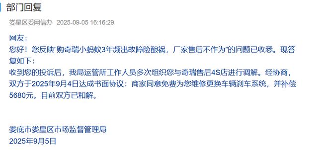 好在车主的维权并未一直陷入僵局。在多次与 4S 店、厂家沟通无果后,她向湖南省娄底市娄星区市场监督管理局发起投诉。接到投诉后,监管部门迅速介入,一方面核实车主提供的维修记录、故障情况等证据,另一方面多次组织车主与奇瑞新能源相关经销商、厂家代表协商。经过多轮调解,双方最终于 2025 年 9 月 4 日达成书面协议。根据协议内容,商家将为车主的车辆免费维修更换全套刹车系统,彻底排查刹车安全隐患;同时,针对车主此前自费更换刹车总泵等部件产生的费用及维权期间的相关损失,商家一次性补偿 5680 元。目前,双方已正式和解,车主的合理诉求得到了回应,这场持续多月的维权终于画上句号。