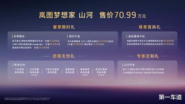 11月21日,广州车展盛大启幕,“新时代旗舰四座MPV”岚图梦想家山河正式上市,售价70.99万元。同步推出山河专属四重礼,包含皓月紫云/拂晓金辉尊属双色车身、20英寸高定星漩轮毂(带岚图悬浮徽标),及殿堂级丹拿品质音响;华为乾崑智驾ADS 4高阶功能包现金抵扣;超级置换补贴;专属定制VIN码权益;三电系统终身质保、车机流量终身免费、道路救援终身免费等权益。