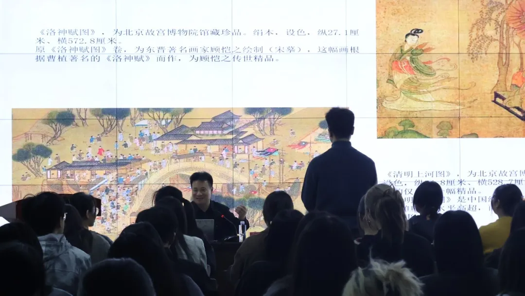 讲座中,翟优以时间为脉络,循着江苏中国画的发展轨迹娓娓道来:从六朝顾恺之的传神写照,到唐代王维的诗画交融;从元代黄公望的浑厚华滋,到明代吴门四家的雅致清新;再到近现代徐悲鸿、傅抱石、李可染等大师的革新突破,系统勾勒出江苏中国画波澜壮阔的千年文脉。整场讲座史料翔实、见解独到,搭配珍贵的作品图像展示,让在场师生沉浸式感受江苏中国画的艺术魅力与历史底蕴。翟优还结合自身艺术创作与传播实践,为同学们分享了从艺之道:从艺是一场“受益终身”的修行,无论未来选择何种职业,这份艺术滋养都将常伴左右、裨益长远;从艺需守住“两个坚持”的初心,既要秉持恒心与毅力,亦要坚守守正创新;从艺更要涵养“三种美”的修为——以发现美的眼睛洞察世界,以创造美的才华赋能实践,以传播美的担当传递价值。他鼓励同学们积极投身学习与实践,在笃行中成长,共创美好未来。
