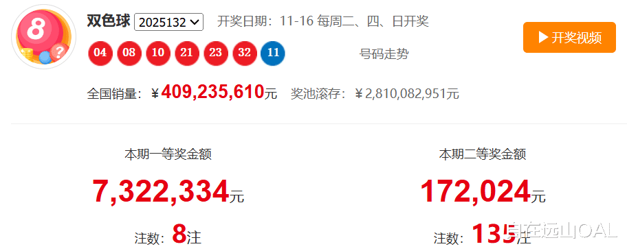 2025132 期双色球已开奖:红球 04、08、10、21、23、32,蓝球 11,奖池高达28.1 亿,8 注头奖瓜分 732 万大奖。结合 111-132 期 22 期数据,从专业维度解析走势,为下期选号提供参考!
