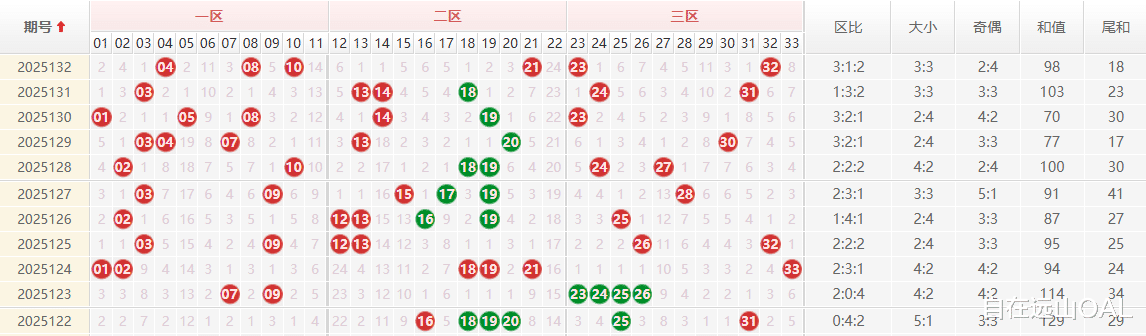 区间分布:本期区间比 3:1:2,一区(04、08、10)表现强势,二区(仅 21)明显断档,符合 “分散为主” 的统计规律,但二区出号偏少需警惕回补。