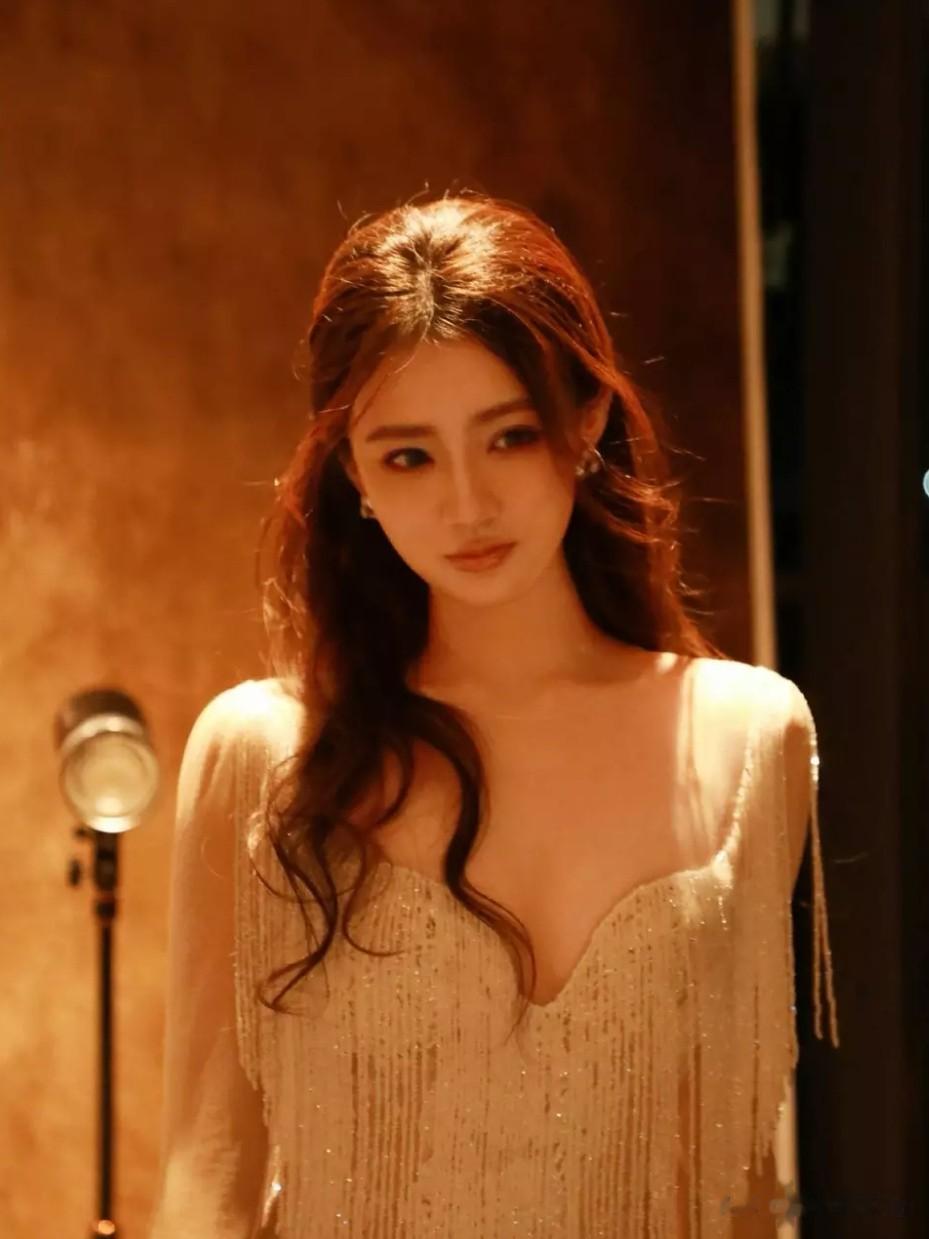 这条耗时128小时打造的流光裙,是新锐设计师品牌MENG HUITING的匠心之作。腰间的鱼骨设计精准勾勒出她纤细的腰线,让58cm的细腰在光影中更显灵动,裙摆处的环保丝绸与回收树脂亮片,让时尚与自然相融,走动时流苏轻摆,像极了江南水乡随波摇曳的柳枝。徐璐的造型团队特意摒弃了利落的盘发,选择将长发烫成慵懒的水波纹卷发,几缕碎发垂在脸颊,既修饰了她极具辨识度的方脸线条,又添了几分不施粉黛的娇憨,与流光裙的精致形成绝妙的平衡——就像江南的园林,既有雕梁画栋的精巧,又有曲径通幽的温柔。