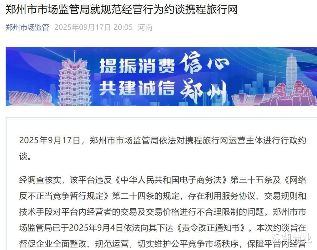 9月17日,据“郑州市场监管”微信公众号消息,郑州市市场监管局依法对携程旅行网运营主体进行行政约谈。