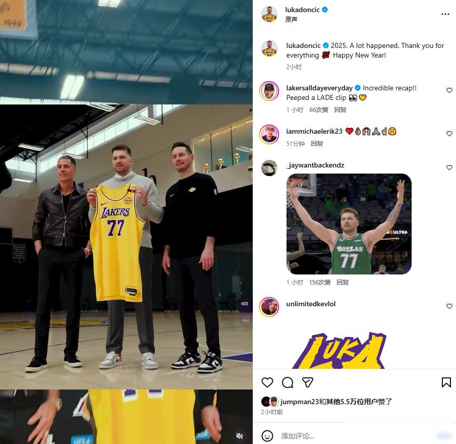 另一边,卢卡·东契奇发了一个十分钟的视频,讲他在2025年的经历,那一年他被独行侠交易到了湖人队,半夜乘坐包机飞到洛杉矶,手里还握着77号球衣,交易发生当天,杜兰特和约基奇等人在社交媒体上发出震惊的表情,他把这些截图都放进视频里,后来他第一次回到达拉斯打客场,球馆播放了致敬他的视频片段,他当场掉下眼泪,嘴唇也抖了起来,詹姆斯走过去拍拍他的肩膀,没有说话,只是陪着他站了一会儿。