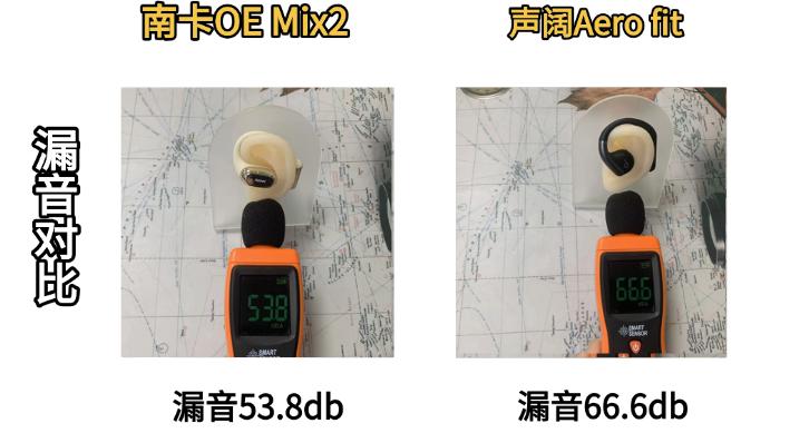 测评维度三、防漏音表现对于开放式耳机来说,漏音一直是个不可避免的问题,毕竟开放式的结构,声音就是容易跑出去。如果设计不到位,那么在安静环境里,就容易打扰到旁边的人,也可能让你听的内容被“公开播放”。所以,防漏音表现可以说是这类耳机的一个硬指标。本次测评,我们将在统一音量条件下,使用专业仪器测量这两款耳机的漏音情况。