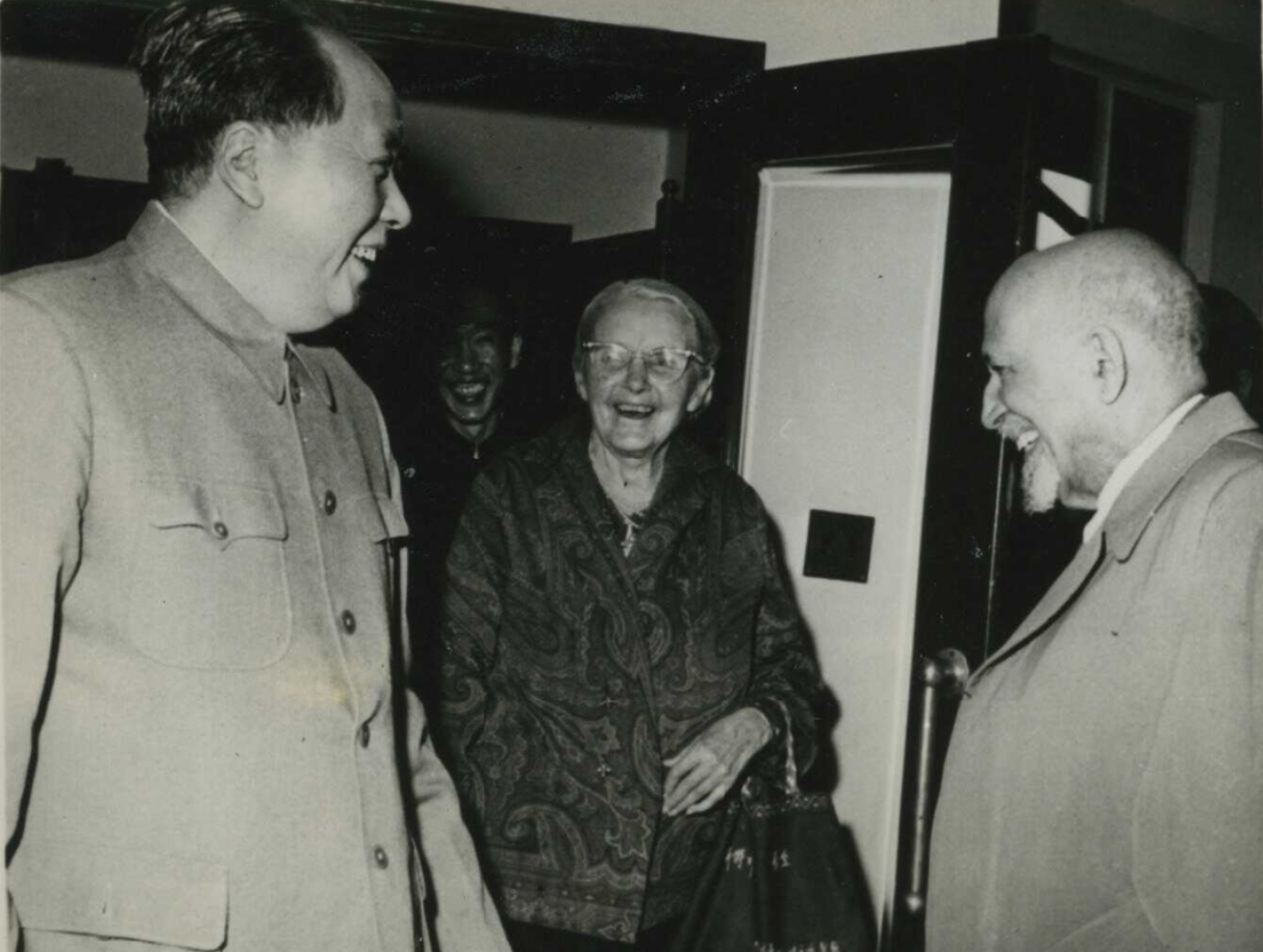 毛主席接见美国作家斯特朗、美国社会学家历史学家杜波依斯。与他们谈话合影。