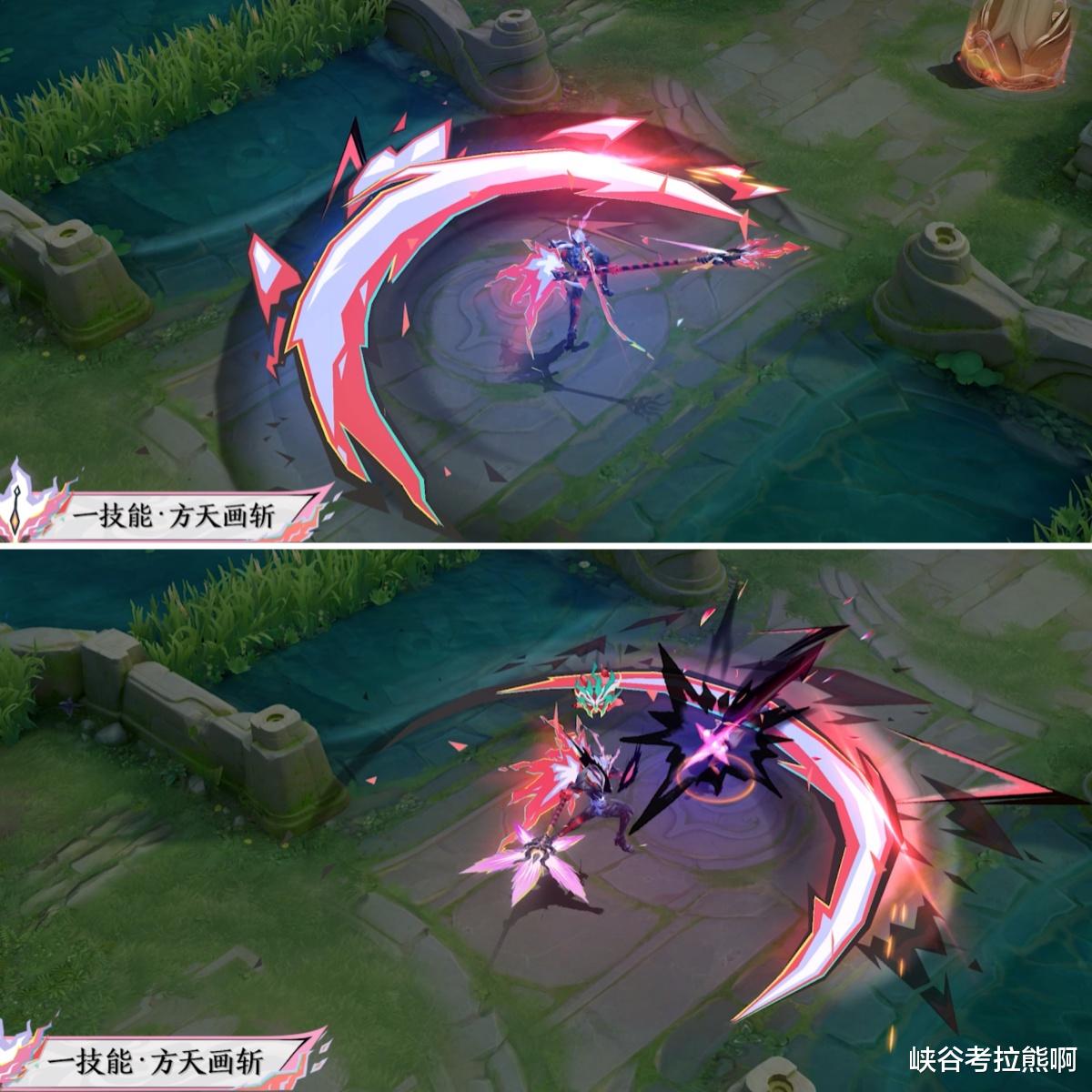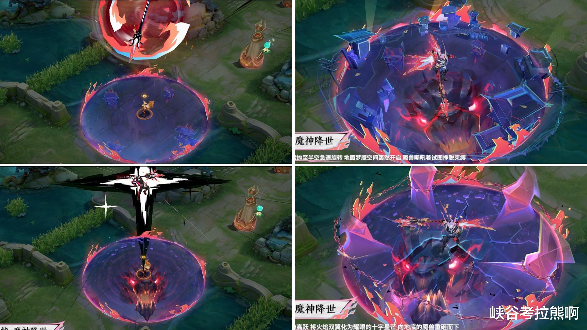 大招是本次最有亮点的设计!首先,起跳后会随机出现方天画戟或黑白色的十字星芒,落地后张开的领域会随机出现建筑崩塌击退魇魔,或是会出现魇魔剧烈挣扎想要挣脱束缚的特效。