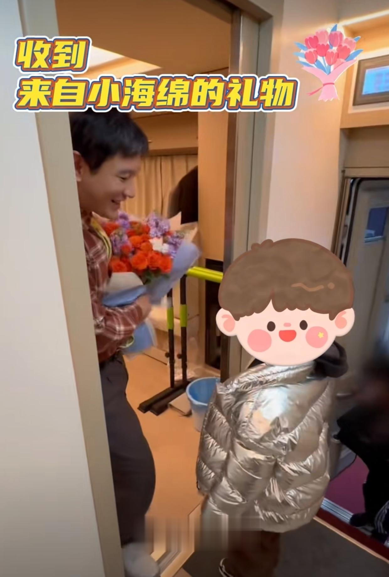 黄晓明在房车里看到小海绵后,整个人都十分开心,弯腰接过了小海绵手里的花,满脸慈爱的说:“谢谢儿子。”