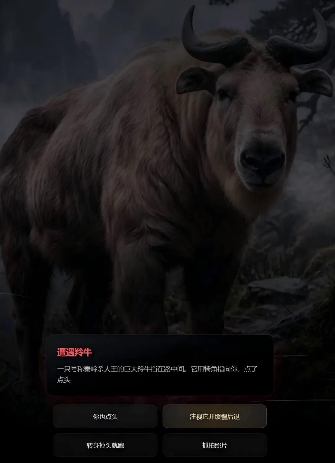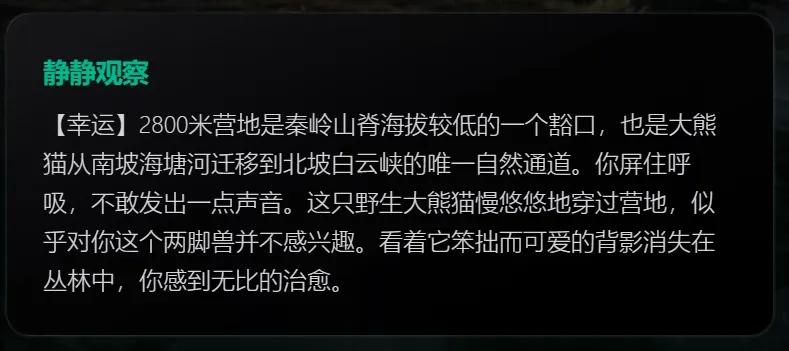 比如,碰到野果子吃不吃?(葡萄君选过吃,直接腹泻,然后发烧,需要消耗医疗包物资来救治)看上去很清澈的水能不能直接喝?(葡萄君选过直接喝,也是腹泻发烧)碰上号称“秦岭杀人王”的巨大羚牛,该怎么办?