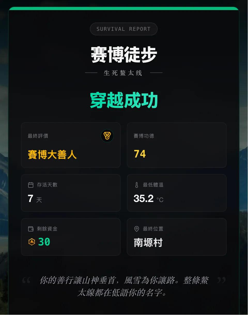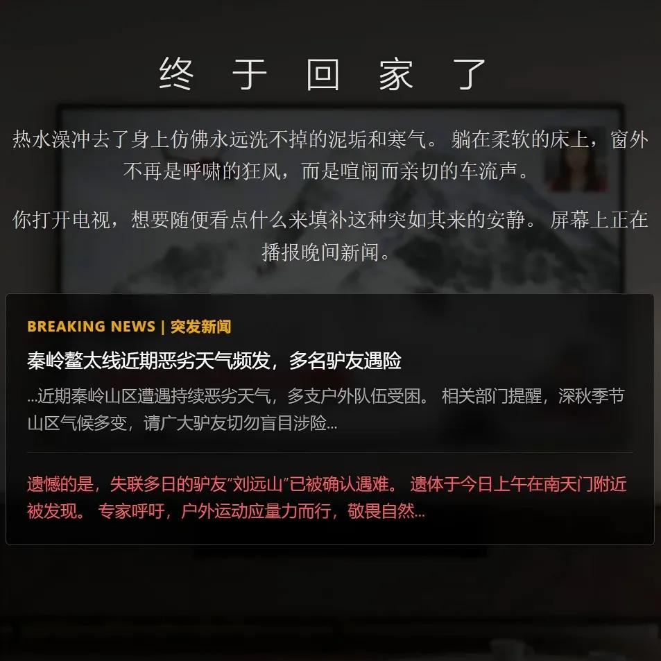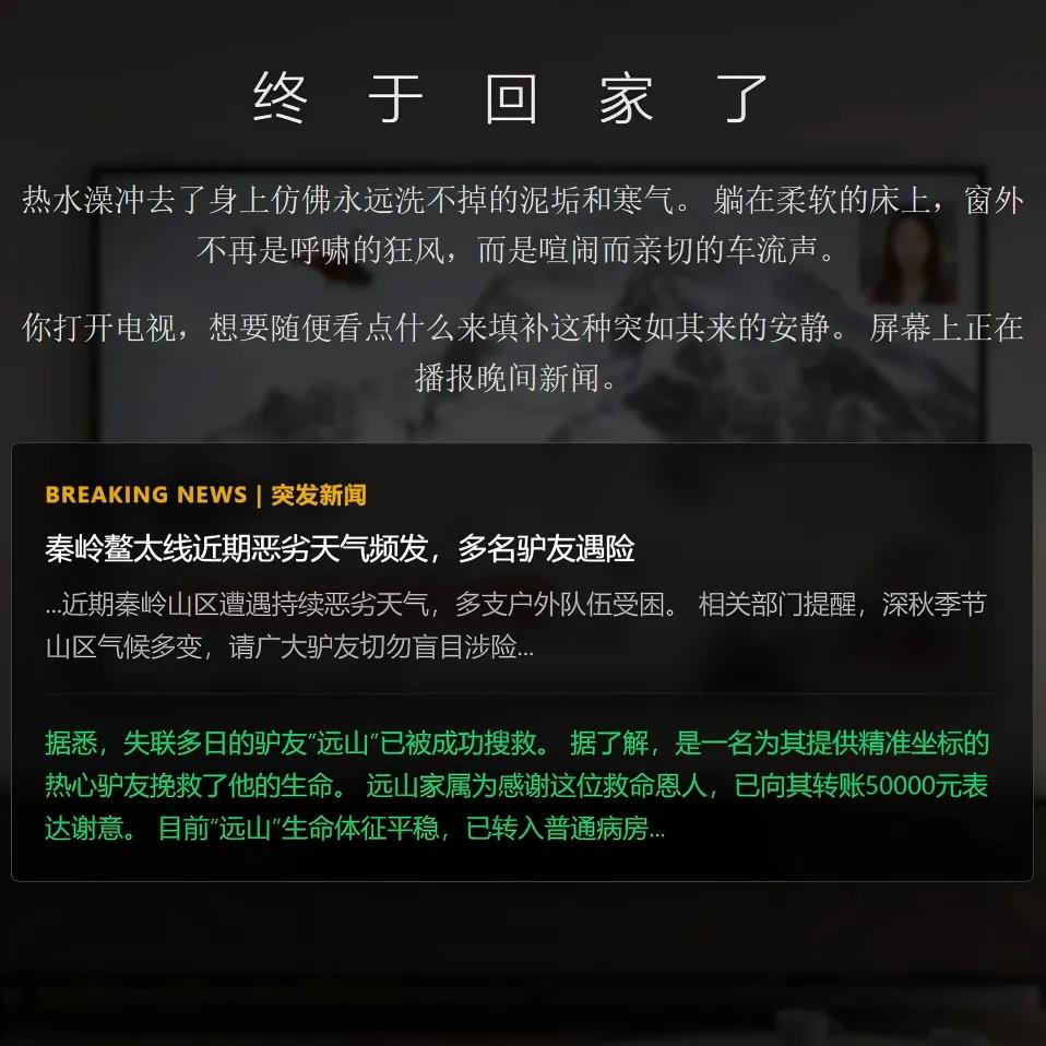 或许《生死鳌太线》的内容体量,依然赶不上现实鳌太线的相关传说,可能现实里惊险的真实穿越故事,也比游戏里的更多。但至少,现在的《生死鳌太线》,已经通过「做选择」这样一种简单的形式,组成了一种复杂多维的情绪体验。