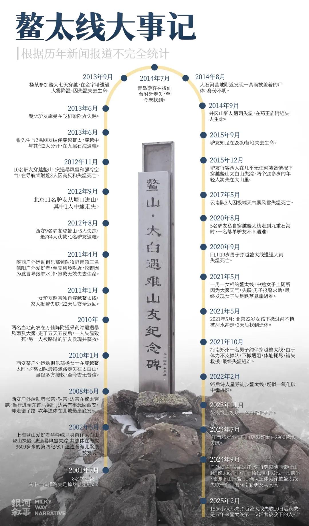 而在2018年,陕西宝鸡眉县、太白县政府联合发布《关于禁止非法穿越“鳌太线”的公告》后,根据澎湃新闻梳理,2018至2024年,仍然有至少12人遇难。