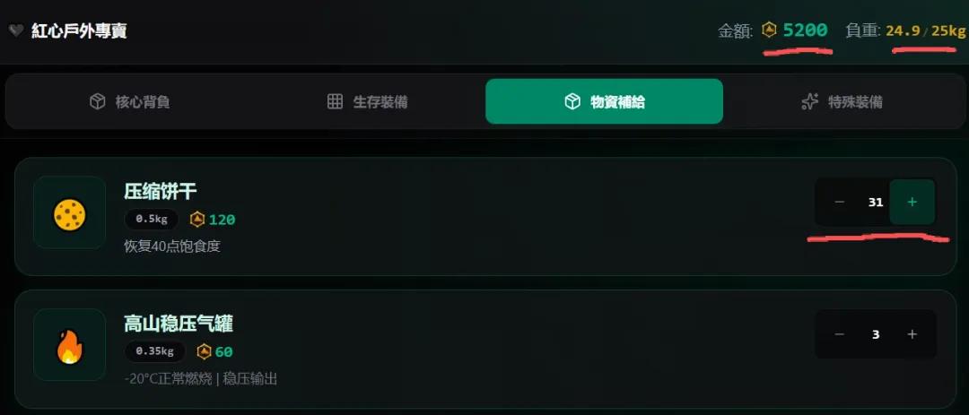 游戏初始会给玩家提供20000元的购买预算,用于购买核心背负(不同容量的背包)、生存装备(登山杖、护膝、手套、帐篷等)、物资补给(压缩饼干、气罐、炉头、医疗包等)。