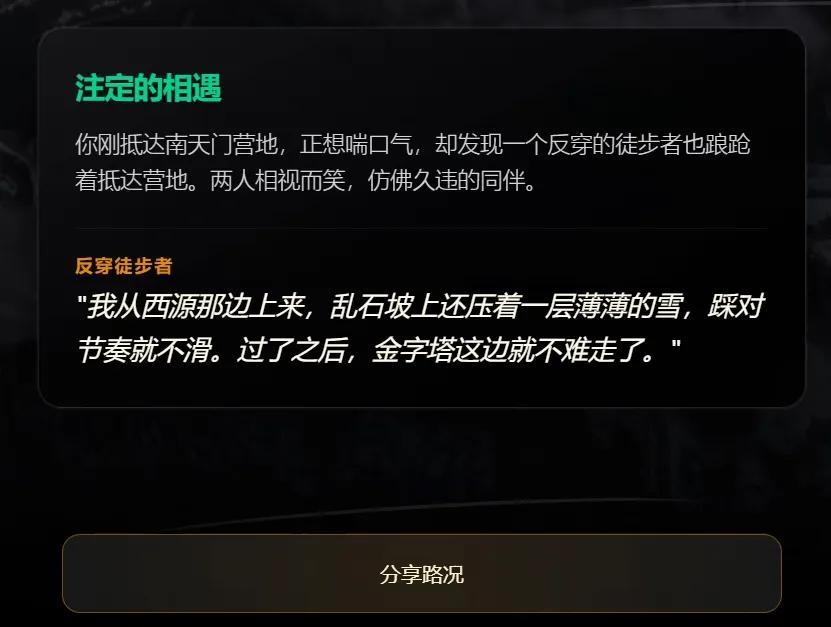 玩家在游戏中体验的主要经历,例如在水窝子营地偶遇「陈眸放」,在前往南天门的路上偶遇「刘远山」等,实际上都是2021年10月,一位来自深圳的22岁探险者「小牟」的真实经历。