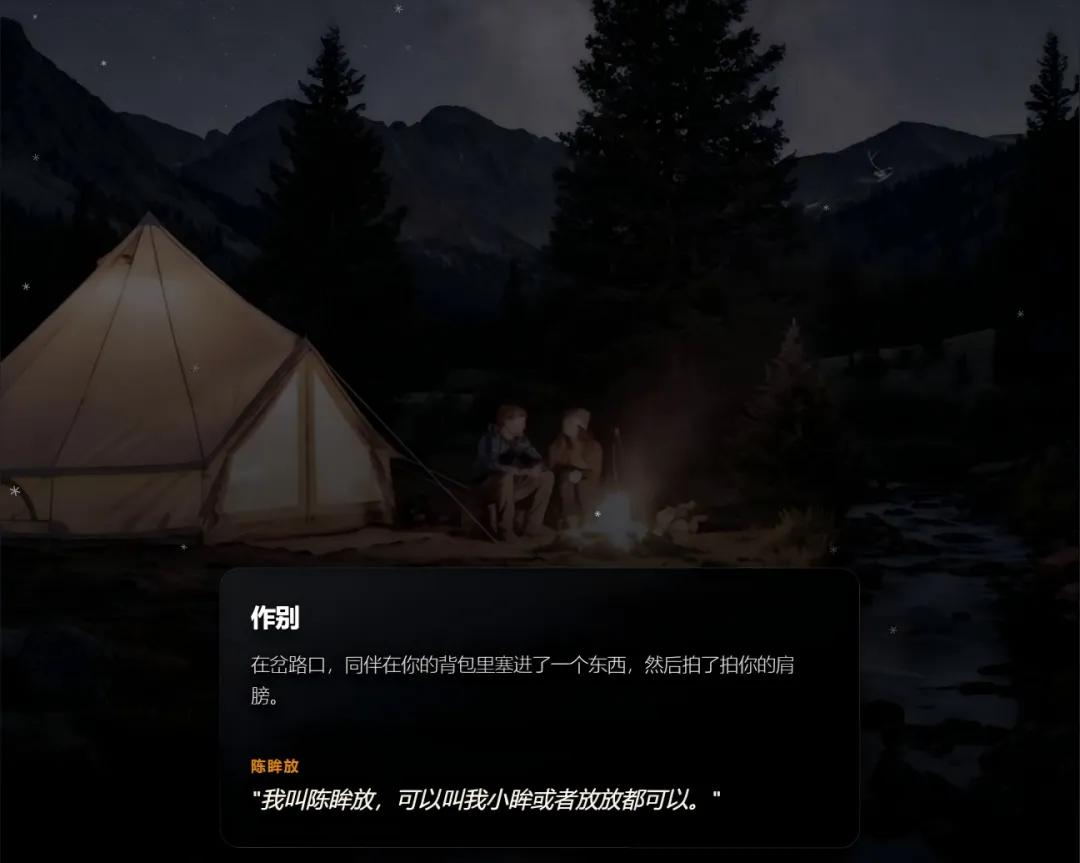 而在水窝子营地,玩家会碰到决定和自己同行的驴友。他在到达2800营地后因为脚肿不适、决定下撤,临走还给玩家塞了个医疗包,他说自己叫陈眸放。(这是个小彩蛋,后文会有解释)