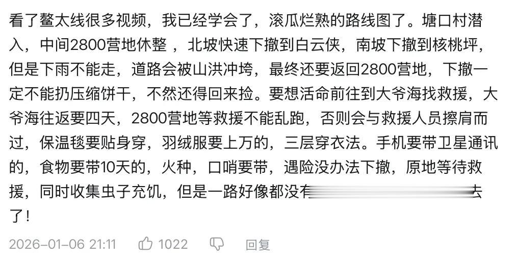 比如我自己在初次尝试时,根本不知道穿越鳌太线到底需要多少天。虽然我尽可能带了够多的保命装备,却只带了两份压缩饼干就上山,最后果不其然被饿死了。