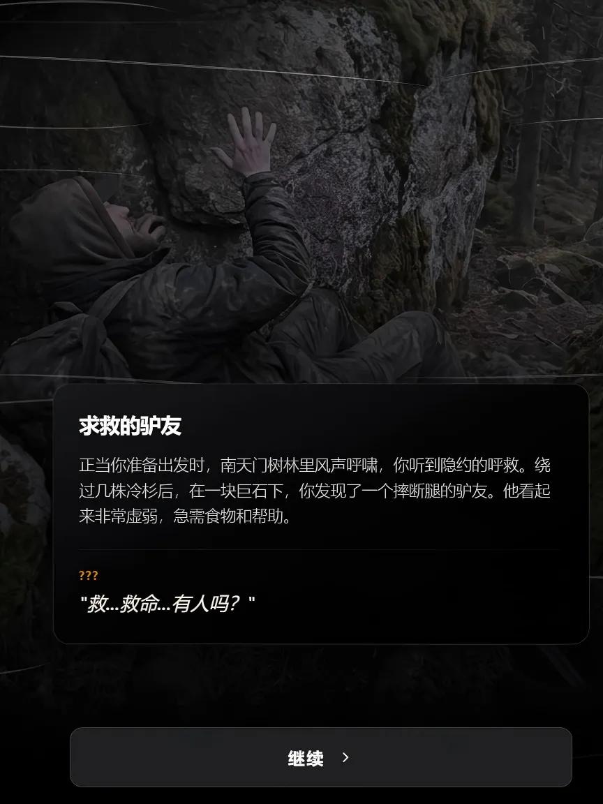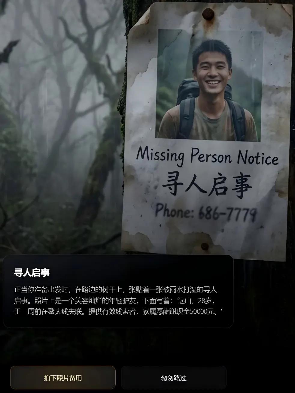 比如在进山开头,玩家会碰到一张寻人启示,说28岁的远山于一周前失联,家属愿意酬谢提供线索者50000元。如果玩家在南天门垭口选择走小路,就会偶遇摔断腿的远山。