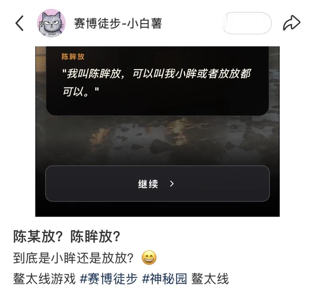 开发者「小白薯」在小红书上表示,角色「陈眸放」灵感就是来自于真实人物「陈某放」,他还在发布的帖子下方,加上了#神秘园 话题。