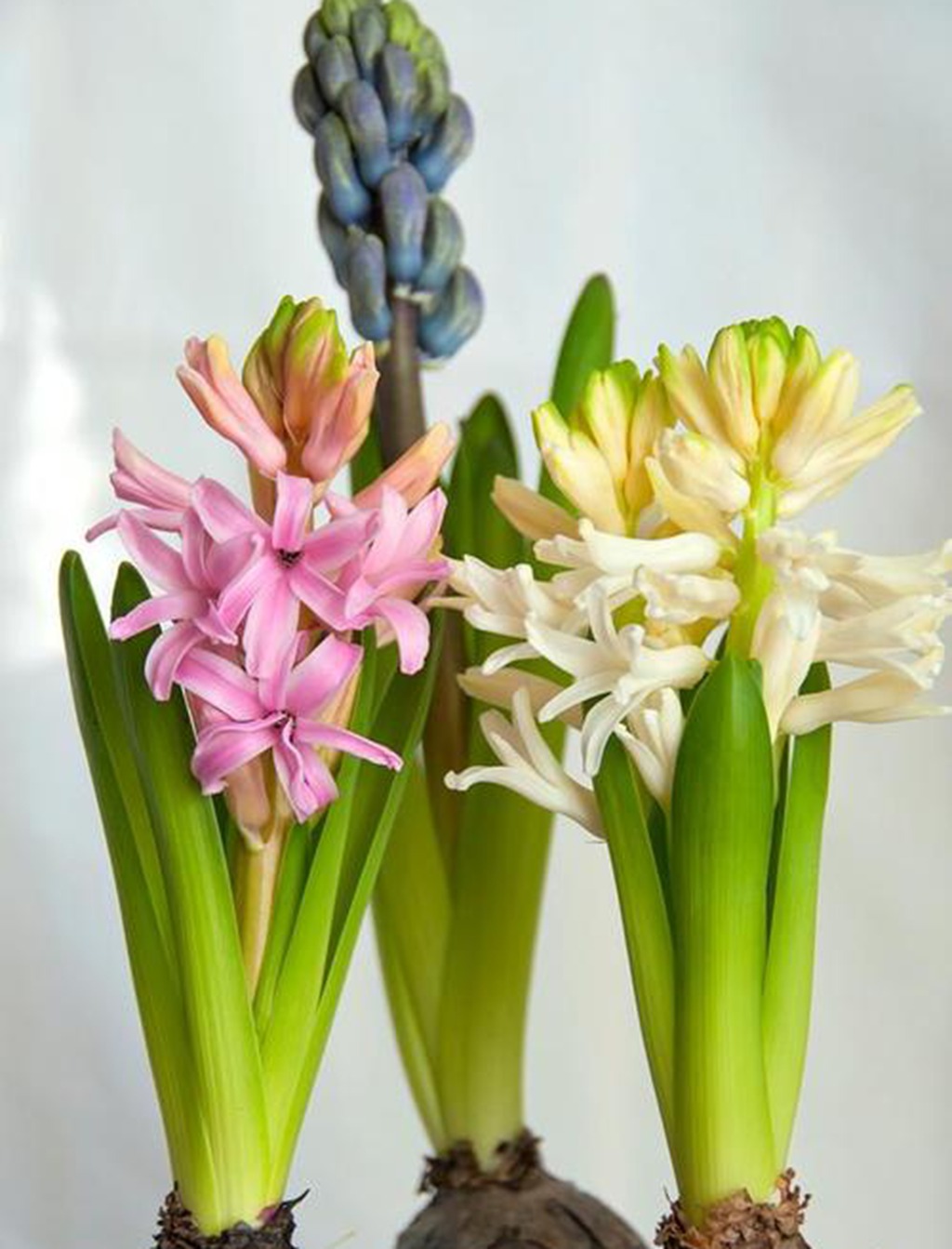 说到风信子的养护,还可以和别的花卉品种比较一下。比如说郁金香和水仙花,这几个都是比较常见的球根花卉。郁金香和风信子看起来有点像,但是郁金香的花型更加挺拔,而且颜色种类也很丰富。不过呢,风信子的花香更浓郁持久。水仙花呢,它一般是没有叶子的,花朵比较简洁。风信子的叶子比较长,而且花朵是成串的。还有仙客来,仙客来喜欢温暖的环境,而风信子对低温的适应能力相对强一些。