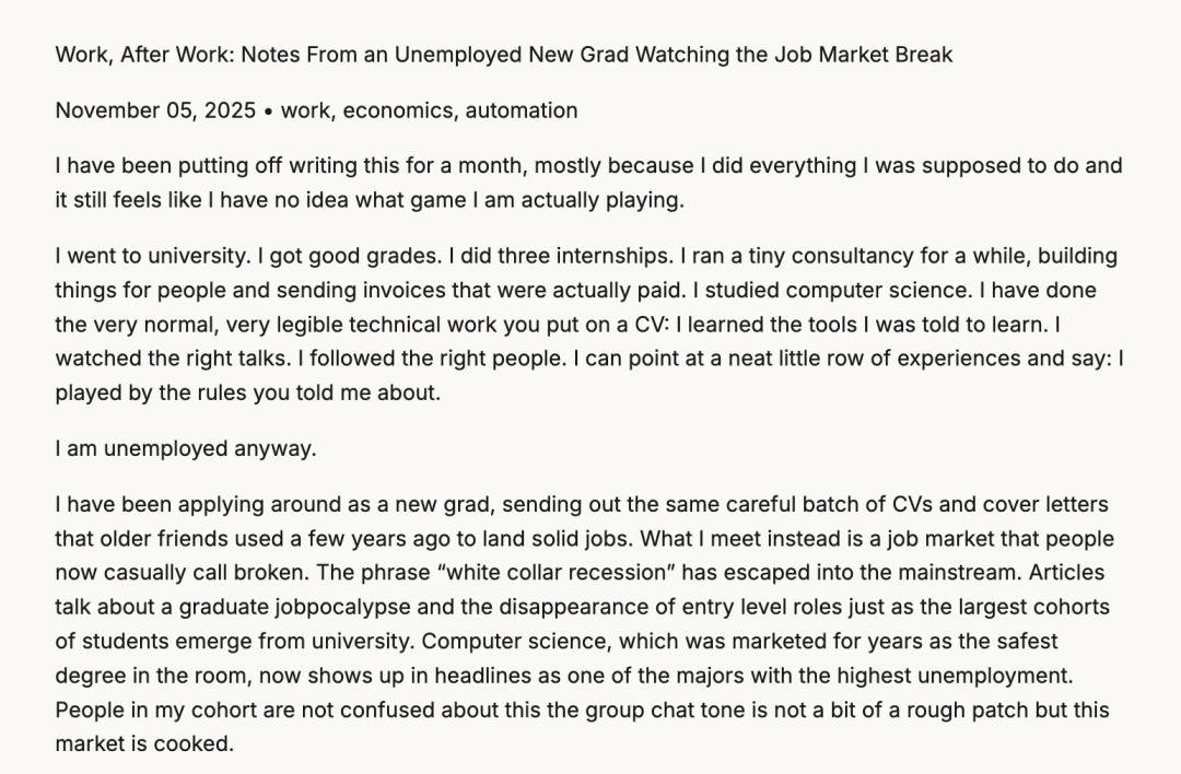 《Work, After Work: Notes From an Unemployed New Grad Watching the Job Market Break》,翻译过来就是:《工作之后:一位失业应届毕业生观察就业市场崩溃的笔记》