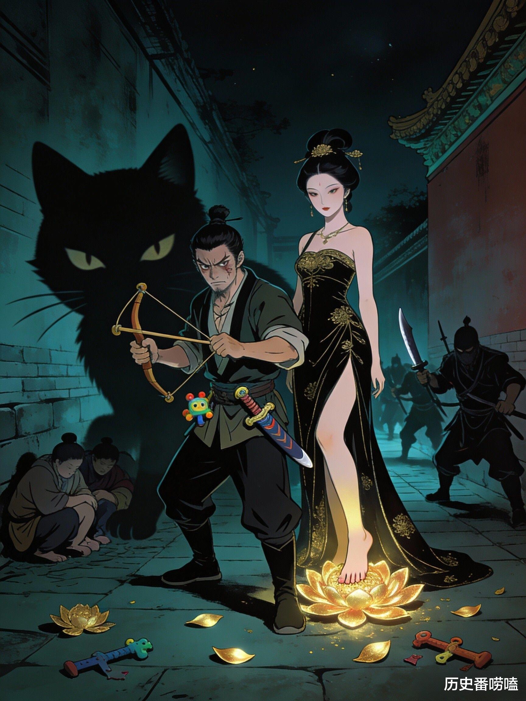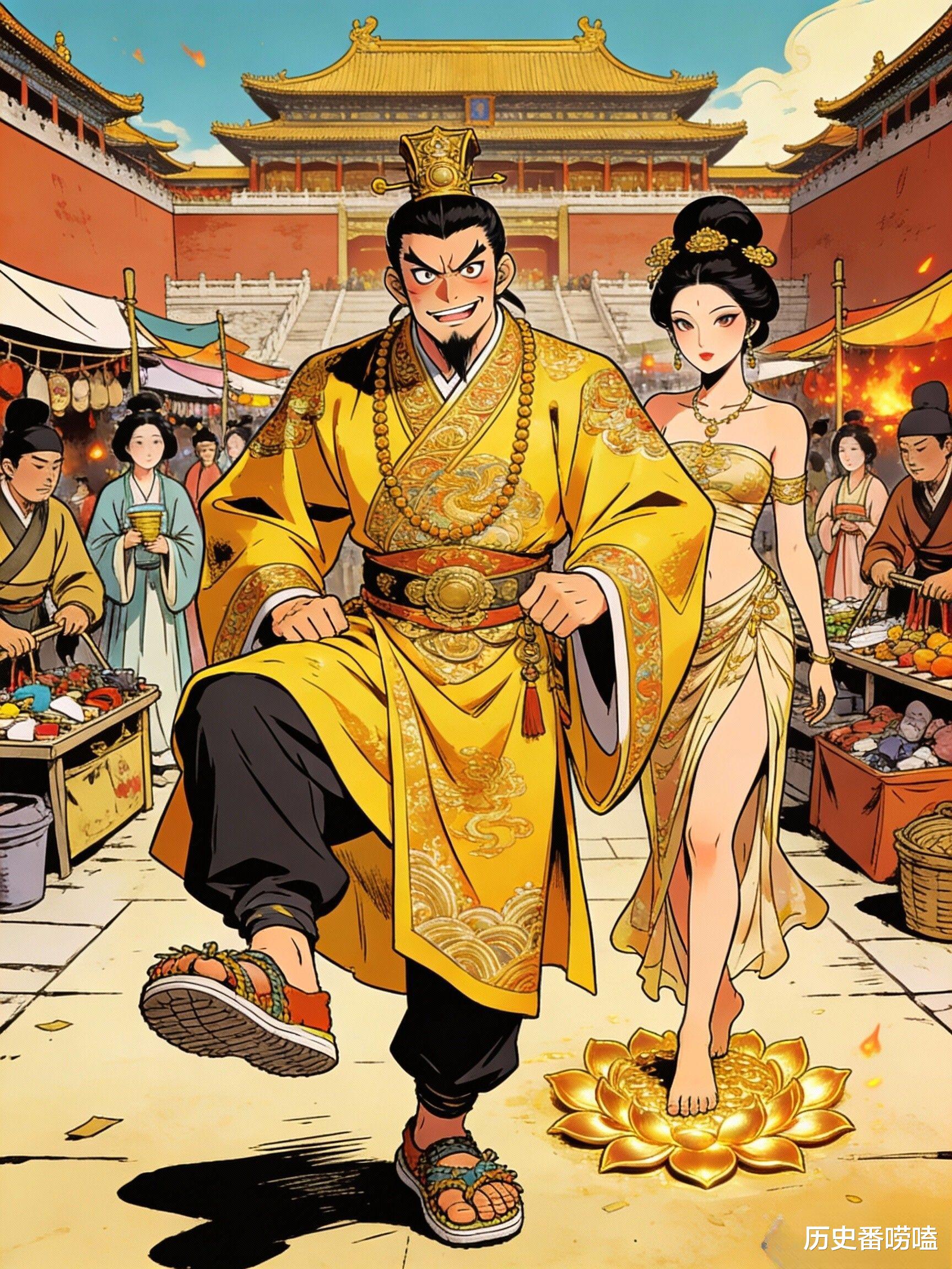 他对宠妃潘玉儿的宠溺,更是野史中浓墨重彩的一笔。潘玉儿身姿曼妙,肌肤白皙,萧宝卷对她言听计从,为了博美人一笑,竟耗费重金凿刻金莲花,一朵朵贴在宫殿的地面上,让潘玉儿穿着轻盈的罗袜在上面行走,步步轻盈,宛若仙人,萧宝卷则在一旁看得痴迷,直呼“步步生莲”,这也成了后世“步步生莲”典故的由来。而这位沉迷角色扮演的帝王,最终也死在了自己的游戏里——在一次深夜“模拟守城”的荒诞游戏中,叛军突袭,他还没反应过来,就被乱兵所杀,死时手中还紧紧攥着玩具刀剑,活成了历史上最可悲的悲剧小丑。