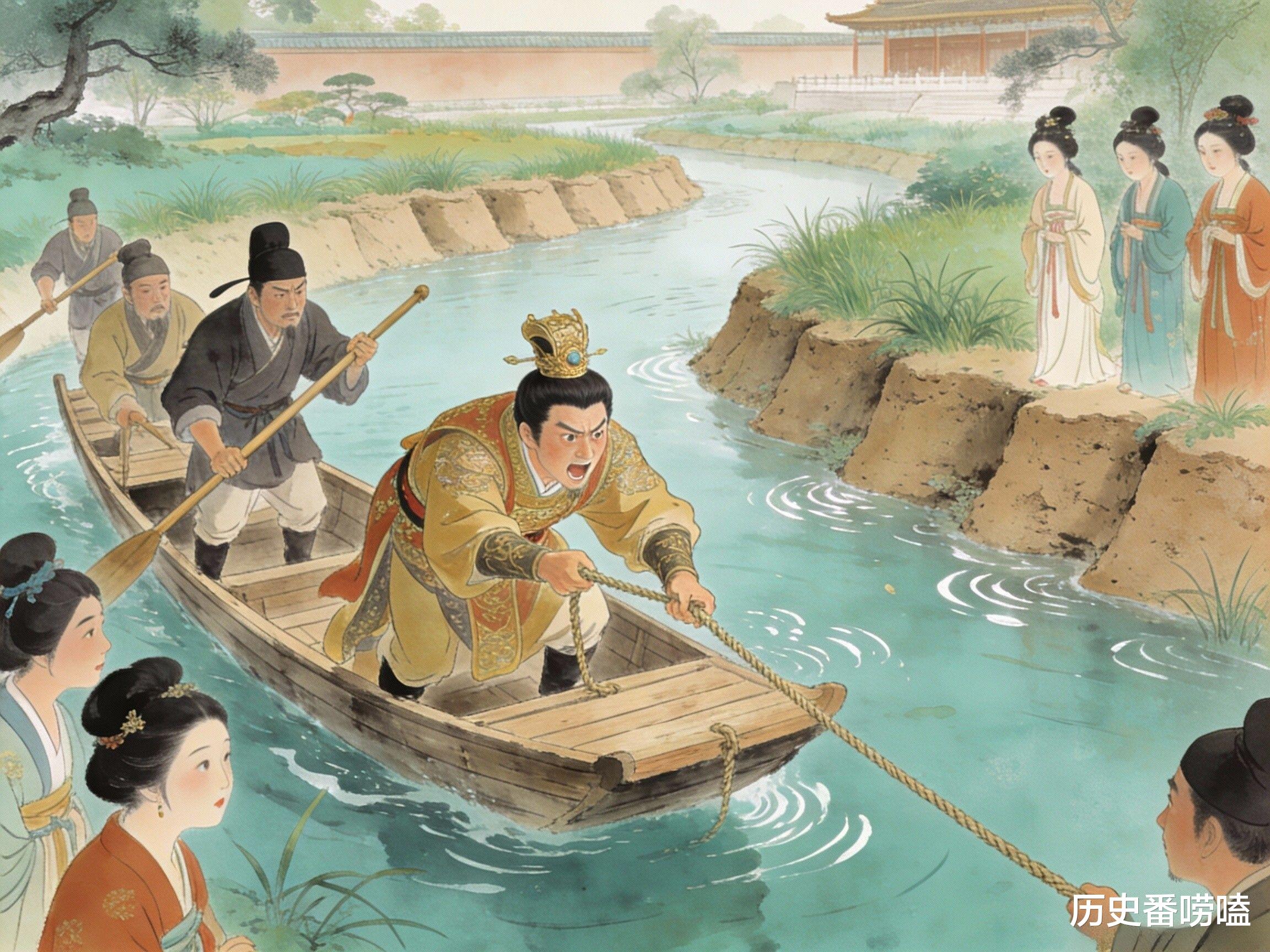 🚤苑囿凿渠拉船,沉迷体力游戏:在皇家园林里开凿水渠,修建土坝,然后自己穿上船夫的衣服,亲自拉着船桨划船,或者拉着船绳在岸边奔跑,不顾帝王身份,沉迷于这种体力游戏,大臣们劝谏也无济于事。